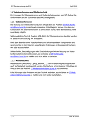 IKT-Dienstanweisung des BMU April 2019 11 Videokonferenzen und Medientechnik Einrichtungen für Videokonferenzen und Medientechnik werden vom IKT-Referat be- darfsorientiert an den Standorten des BMU bereitgestellt. 11.1 Videokonferenzen Die Buchung von Videokonferenzräumen erfolgt über das Postfach IT-VKTK-Konfe- renz@bmu.bund.de in der Regel mindestens 3 Werktage im Voraus. Vor allem zur Koordination mit externen Partnern ist ohne diesen Vorlauf eine Bereitstellung nicht zuverlässig möglich. Sollte zusätzliche Technik (Laptop, USB-Stick) für Videokonferenzen benötigt werden, ist diese bei der Buchung mit anzugeben. Nach dem Beenden einer Videokonferenz sind alle eingesetzten Komponenten ent- sprechend der in den Räumen ausgehängten Anleitungen ordnungsgemäß zu been- den oder auszuschalten. Sollten Fehler, Beschädigungen oder Einschränkungen bei der Nutzung von Video- konferenztechnik bemerkt werden, so sind diese an IT-VKTK-Konfe- renz@bmu.bund.de zu melden und nicht selbst zu beheben. 11.2 Medientechnik Medientechnik (Mikrofone, Laptop, Beamer, …) kann in allen Besprechungsräumen nach Verfügbarkeit bereitgestellt werden. Die Buchung ist mindestens 3 Werktage im Voraus über das Postfach IT-Medientechnik@bmu.bund.de vorzunehmen. Falls Störungen oder Probleme mit der Technik auftreten, so sind diese an IT-Medi- entechnik@bmu.bund.de zu melden und nicht selbst zu beheben. ZI5 Seite 26 von 28