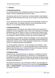 IKT-Dienstanweisung des BMU April 2019 2 Hardware 2.1 Standardausstattung Zur Standardausstattung eines Arbeitsplatzes gehören PC-Zugang mit Bildschirm, Tastatur und Maus, Arbeitsplatzdrucker sowie ein Telefon. Für Ausdrucke stehen für die IT-Nutzerinnen und Nutzer überdies in allen Gebäude- abschnitten zentrale Netzwerkdrucker bereit, die eine Vielzahl von Komfortfunktionen bieten. Für den vertraulichen Druck kann beim Absenden des Druckauftrages „Sicheres Dru- cken“ gewählt werden. Die Ausgabe erfolgt dann erst bei Authentifizierung (PIN, Passwort, o.ä.) am jeweiligen zentralen Netzwerkdrucker. 2.2 Sonderausstattung Arbeitsplätze können auf Antrag (für einen längeren Zeitraum oder dauerhaft) mit zusätzlicher Hardware ausgestattet werden. Hierzu ist ein Antrag über die zuständige Referatsleitung an das IKT Referat zu richten. Der Antrag soll die Funktionen erläu- tern, die zur Erfüllung der Aufgaben erforderlich sind. Die dienstliche Notwendigkeit ist zu begründen, wobei auch Umfang und Dauer der Nutzung anzugeben sind. Die Bereitstellung von zusätzlicher Hardware ist abhängig von einem angemessenen Kosten-Nutzen-Verhältnis, der Vereinbarkeit (Kompatibilität, Administrierbarkeit) der angeforderten Hardware mit der im BMU eingesetzten Standard-Hard- und Software und den zur Verfügung stehenden Haushaltsmitteln. Zur nicht dauerhaften Verwendung, z. B. für Dienstreisen, kann Hardware - insbe- sondere Notebook, Beamer etc. - zur Verfügung gestellt werden. Entsprechende An- träge sind unter Nennung von Art, Umfang und der Dauer der Nutzung an das Post- fach IT-Ausleihe (IT-Ausleihe@bmu.bund.de) zu richten. 2.3 Mobiles Arbeiten Entsprechend der „Dienstvereinbarungen zur Regelung von Arbeitszeit und Arbeits- ort“ und der „Rahmendienstvereinbarung zur Einrichtung von Telearbeitsplätzen im Geschäftsbereich des BMU“ stellt das IKT-Referat die notwendige technische Ausstat- tung für die verschiedenen Modelle des mobilen Arbeitens bereit und richtet die dafür benötigten Berechtigungen ein. Die aktuellen Informationen zu den verschiedenen Verfahren, den notwendigen An- gaben und die entsprechenden Formulare sind im Intranet unter Personalmanage- ment -> mobiles Arbeiten <http://intranet/Z/I/1/Personalmanagement/Mobi- les_Arbeiten> abzurufen. ZI5 Seite 7 von 28