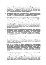 Frage 9: Bei den Leitbildkonferenzen wurde dargestellt, dass einwohnerstärkere Landkreise weniger Personal je Einwohner vorweisen? Die Kommunen verweisen jedoch auf unterschiedlich hohe Transferleistungen an verschiedene Träger, die verschiedenste Aufgaben übernommen haben. Wie hoch sind die Transferleistungen an andere Trä- ger in den einzelnen Landkreisen für kommunale Aufgaben und welche Aufgaben umfassen diese? zu Frage 9: Der Landesregierung liegen keine Erkenntnisse darüber vor, welche kommunalen Transferleistungen an welche Träger und für welche Aufgaben und in welcher Höhe geleistet werden. Frage 10: In der KA 1254 informieren Sie, dass die Hauptansatzstaffel für einzukreisende Städ- te, die auch Oberzentrum bleiben, finanzwissenschaftlich zu untersuchen sein wird, wenn die zukünftigen Gebietsstrukturen feststehen. Wenn es für die zu erwartenden Kosten bisher keine Prognose gibt, wie ist es dann möglich, Kosteneinsparungen durch eine Einkreisung in Aussicht zu stellen? (Bitte ausführlich erläutern, wie die Kosteneinsparungen in den Oberzentren erwirtschaftet werden sollen!) zu Frage 10: Brandenburg an der Havel, Cottbus und Frankfurt (Oder) sollen insbesondere auch durch Übergang von pflichtigen Kreisaufgaben auf die Landkreise entlastet werden. Die Landesregierung geht davon aus, dass Landkreise mit einer größeren Einwoh- nerzahl leistungsfähigere Verwaltungsstrukturen haben. Gleichzeitig sollen die über- regionalen Funktionen der Oberzentren auch im Rahmen des kommunalen Finanz- ausgleichs gestärkt werden. Die Entscheidungen in der Sache wird der Gesetzgeber bei der Novellierung des Brandenburgischen Finanzausgleichsgesetzes treffen. Zur Vorbereitung dieses Verfahrens wird die Landesregierung nach der Grundentschei- dung über die neue Kommunalstruktur ein finanzwissenschaftliches Gutachten zur Symmetrieüberprüfung 2019 und zur Weiterentwicklung des Kommunalen Finanz- ausgleichs vergeben. Aus heutiger Sicht soll das Gutachten unter anderem auch ge- eignete Instrumente zur wirksamen Stärkung der Oberzentrenfunktion im horizonta- len Finanzausgleich (beispielsweise Hauptansatzstaffel und Mehrbelastungsaus- gleich) ermitteln und bewerten. Im Übrigen wird auf die Antworten zu den Fragen 1 und 12 bis 14 der Landesregierung zur Kleinen Anfrage 1350 (Landtags-Drucksache 6/3405) verwiesen. Frage 11: In der KA 1254 sind 3 Anlagen mit insgesamt 20 Seiten der verschiedensten Zuwen- dungen für die Stadt Cottbus zusammengefasst. Ich gehe davon aus, dass dieses Fördersystem für alle Kommunen gleichförmig gilt. Dazu ist ein sehr aufwändiger Personal- und Verwaltungsaufwand erforderlich. In Baden-Württemberg wird der Aufwand für das Fördersystem mit ca. 35% im Durchschnitt der zu fördernden Kos- ten auf der Seite des Landes eingeschätzt. Wie hoch wird der personelle Aufwand in den Kommunen in Brandenburg eingeschätzt, diese sind neben der Antragstellung und Begründung auch für die ordnungsgemäße Umsetzung bzw. Bauausführung und Verwendungsnachweisführung zuständig?