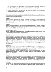 der Antragstellung und Begründung auch für die ordnungsgemäße Umsetzung bzw. Bauausführung und Verwendungsnachweisführung zuständig? 12. Welche Initiativen und Vorhaben gibt es, diesen personellen und verwaltungs- technischen Aufwand zu reduzieren? Namens der Landesregierung beantwortet der Minister des Innern und für Kommu- nales die Kleine Anfrage wie folgt: Frage 1: Welche Kosten werden für die Reform notwendig und welche Summen sollen aus dem allgemeinen Finanzausgleich dafür verwendet werden? (Bitte für die nächsten 5 Jahre darstellen) Frage 2: Welche Summen werden für die Ablösung von Kassenkrediten in Städten, Gemein- den und Landkreisen eingeplant, sind diese Finanzmittel auch als Kosten für die Re- form eingeplant? (Bitte einzeln auflisten!) zu den Fragen 1 und 2: Auf die Antwort der Landesregierung zu Fragen 4, 8 und 9 der Kleinen Anfrage 1350 - Landtagsdrucksache 6/3405 – wird verwiesen. Frage 3: Strukturschwache Gemeinden werden einerseits auf Hilfen durch den Ausgleichs- fonds verwiesen, andererseits berichten die Gemeinden, dass ihre Anträge (so ein Schreiben aus dem MIK) aus den Jahren 2014 und 2015 zurückgezogen werden sollen, weil eine neue Richtlinie in Erarbeitung ist. Welche Gemeinden haben seit 2014 finanzielle Unterstützung aus dem Ausgleichsfonds erhalten und wofür? (Bitte auflisten! — Die Antworten aus der KA 1170 wurden bei der Aufstellung dieser KA berücksichtigt.) zu Frage 3: Welche Gemeinden und Landkreise finanzielle Mittel aus dem Ausgleichsfonds er- halten haben, ist der Antwort der Landesregierung auf die Fragen 1 und 2 der Klei- nen Anfrage 1185 – Landtagsdrucksache 6/2787 – zu entnehmen. Welche Gemeinden darüber hinaus nach dem 30.09.2015 Zuweisungen aus dem Ausgleichsfonds gemäß § 16 BbgFAG erhalten haben, ist in der Übersicht gemäß Anlage 3 a) dargestellt. Frage 4: Von welchen Gemeinden liegen seit 2014 Anträge für den Ausgleichsfonds vor, in welcher Höhe und für welche Maßnahmen, insbesondere für Pflichtaufgaben wie technische Infrastruktur (Straßen, Brücken, Schulgebäude, Kindereinrichtungen usw.), deren Anträge bisher nicht bewilligt oder abgelehnt wurden? (Bitte auflisten!) zu Frage 4: Gemeinden und Landkreise, die Investitionshilfen aus dem Ausgleichsfonds gemäß § 16 Abs. 1 Ziffer 3 BbgFAG seit dem Jahr 2014 beantragt haben, sind der Anlage 7c)