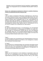 Gespräche mit dem Amt Schradenland sowie den betroffenen Landwirtschaftsbe- trieben in der Vergangenheit auch zum Schöpfwerk Merzdorf geführt? (bitte auf- listen) Namens der Landesregierung beantwortet der Minister für Ländliche Entwicklung, Umwelt und Landwirtschaft die Kleine Anfrage wie folgt: Frage 1: In der o.g. Antwort in Drucksache 5/7728 gab die Landesregierung an, dass die Sa- nierung des Schöpfwerks Merzdorf durch die Begutachtungskommission des LUGV bis zur Fertigstellung der regionalen Maßnahmenplanung zum Hochwasserrisikoma- nagement Schwarze Elster zurückgestellt wurde. Für den Teileinzugsbereich der Schwarzen Elster liegen die Gefahren- und Risikokarten seit Längerem vor. Wie ist der aktuelle Stand hinsichtlich der regionalen Maßnahmenplanung zum Hochwasser- risikomanagement Schwarze Elster, welches nach EU- und Bundesrecht bis zum 22.12.2015 zu erstellen und zu veröffentlichen ist? (bitte erläutern) zu Frage 1: Die regionalen Maßnahmenplanungen im Land Brandenburg, die nicht Bestandteil des EU- und Bundesrechtes zur Umsetzung der EG HWRM-RL sind, stellen infor- melle Planungen zur Untersetzung der HWRMP Elbe bzw. Oder unter Beteiligung der zuständigen Akteure dar. Für die regionale Maßnahmenplanung im Einzugsge- biet der Schwarzen Elster wird im April 2015 ein Entwurf vorliegen. Der Entwurf wird im Anschluss öffentlich diskutiert (siehe Antwort zu Frage 3). Frage 2: Zu welchem Ergebnis kam die Neubewertung der Richtwasserstände auf der Grund- lage des hydrologischen Modells für die Pulsnitz von der Landesgrenze zu Sachsen bis zur Mündung in die Schwarze Elster? Zu Frage 2: Eine Neubewertung von Richtwasserständen des Hochwasser-Alarmpegels Ortrand erfolgte noch nicht. Für die Umsetzung dieser Aufgabe ist eine gesonderte Untersu- chung unter Nutzung der hydraulischen und hydrologischen Grundlagendaten der Hochwasserrisikomanagementplanung erforderlich. Frage 3: Werden das Amt Schradenland und die betroffenen 6 Agrarbetriebe seitens des LUGV bzw. der Landesregierung über den Fortschritt der Hochwasserrisikoma- nagementplanung Schwarze Elster regelmäßig informiert? Wenn ja, wann wurden