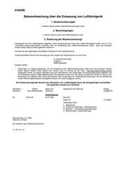 ZUSÄTZLICHE BESCHRÄNKUNGEN UND INFORMATIONEN ZUR MUSTERZULASSUNG (e) Die Kennung des Luftfahrzeuges (Kennzeichen usw.) sollte auf der Kopie hinzugefügt werden, die Teil des