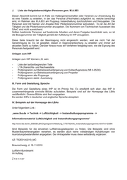 J. Liste der freigabeberechtigten Personen gem. M.A.803 Dieser Abschnitt kommt nur im Falle von Haltergemeinschaften oder Vereinen zur Anwendung. Es ist eine Tabelle zu erstellen, in der das Personal (Pilot/Halter) aufgeführt ist, welche berechtigt sind, im Rahmen des M.A.803 am Flugzeug Instandhaltung durchzuführen und freizugeben. Die Personen sind mit Namen und Angabe Ihrer Pilotenlizenznummer aufzulisten. Es ist die Art der Tätigkeit und die Pilotenlizenznummer anzugeben. Die Nummern von Technischen Ausweisen des DAeC sind nicht ausreichend. Sollten bestimmte Personen auf bestimmte Arbeiten und deren Freigabe beschränkt sein, so ist die Bezugsnummer der Tätigkeit gemäß der Auflistung im IHP anzugeben. Diese Seite braucht bei der Beantragung nicht eingereicht werden, weil sie nicht Teil der Genehmigung ist. Es ist gestattet, diesen in Eigenverantwortung zu erstellen und immer auf aktuellen Stand zu halten. Darüber hinaus muss ein Verfahren festgelegt sein, wie die Eignung des Personals festgestellt wird. Anlagen zum IHP Anlagen zum IHP können z.B. sein: - Liste der laufzeitbegrenzten Teile - LTA-Übersichts- und Nachweisliste - Prüfprogramm zur Betriebszeitverlängerung von Kolbenflugmotore (Nfl II-95/00) - Prüfprogramm zur Betriebszeitverlängerung von Propeller - Prüfprogramm alte Flugzeuge - Prüfprogramm elektr. Ausrüstung III. Form und Gestaltung, Sprache Die Form und Gestaltung eines IHP ist im Prinzip frei. Es empfiehlt sich aber, das IHP in zusammenhängende sinnvolle Blöcke aufzuteilen. Beispiele sind auf der Homepage des LBAs veröffentlicht. Diverse Blöcke sind fest vorgegeben. Es werden IHPs in deutscher und englischer Sprache akzeptiert. IV. Beispiele auf der Homepage des LBAs Unter folgendem Link : „www.lba.de -> Technik -> Lufttüchtigkeit -> Instandhaltungsprogramme -> Informationsmaterial Lufttüchtigkeit und Instandhaltungsprogramme“ http://www.lba.de/cln_009/DE/LBA/Organigramm/Abteilung_T/T5/T52/Info_Instandhaltungsprogemme.html?nn=23094 Sind Beispiele für die einzelnen Luftfahrzeugkategorien zu finden. Die Beispiele sind ohne Muster/Baureihenangaben versehen, es werden auch keine vollständigen Aufzählungen von Ausrüstungsbestandteilen angegeben. Der Antragsteller muss diese selbständig ergänzen. AZ: T52E01A0210_MC Braunschweig, d. 18.11.2010 Luftfahrt-Bundesamt Im Auftrag Zrenner