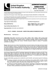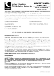 G-2004-0010 page 2 of 2 2) Interim Action Fit an EEC incorporating a revised standard of engine control software as specified in Rolls-Royce Alert Service Bulletin RB211-73-AE224 original issue or later CAA approved revision, or later standard of engine control software, before 1 July 2005. 3) Terminating Action Fit redesigned HP compressor stage 1 casing and intermediate case outer location ring in accordance with Rolls- Royce Service Bulletin RB211-72-D574 original issue or later CAA approved revision, Section 3 Accomplishment Instructions within 4500 cycles of the Effective Date of this Airworthiness Directive or before 30 June 2012 whichever is the sooner. Incorporation of this modification removes the requirement to carry out 1) In-Service Test and 2) Interim Action and therefore constitutes the terminating action for this Airworthiness Directive. Reference Publications: Rolls-Royce Alert Service Bulletin RB211-71-AD509 revision 3 or later approved issue, Rolls-Royce Alert Service Bulletin RB211-73-AE224 original issue or later CAA approved revision, Rolls- Royce Service Bulletin RB211-72-D574 original issue or later CAA approved revision may be obtained from Publication Services, Rolls-Royce plc, PO Box 31, Derby, DE24 8BJ, United Kingdom. Phone: +44 (0) 1332 242424 Fax: +44 (0) 1332 249936. Remarks: Enquiries regarding this AD may be directed to Civil Aviation Authority, Safety Regulation Group, Propulsion Department, Aviation House, Gatwick Airport South, West Sussex, RH6 0YR, United Kingdom. Phone: +44 (0) 1293 573199 Fax: +44 (0) 1293 573979 E-mail: tony.boud@srg.caa.co.uk.