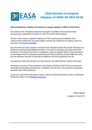 vorläufige Rücknahme der brasilianischen ANAC AD 2017-03-01 durch die EASA bekanntgegeben. Bis zu einer