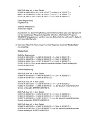 4 4500 Fuß über NN in dem Gebiet: 475928 N 095419 O – 481114 N 102357 O – 480519 N 102032 O – 480011 N 102508 O – 475911 N 103431 O – 474727 N 100457 O – 475313 N 100747 O – 475822 N 100312 O – 475928 N 095419 O. Obere Begrenzung: Flugfläche 75. Zeitliche Wirksamkeit: 24 Stunden täglich. Ausnahmen von dieser Verpflichtung können fernmündlich oder über Sprechfunk von der zuständigen Flugsicherungsstelle 'München Information' (Frequenz 126,950 MHz) zugelassen werden, wenn die Sicherheit des Luftverkehrs dadurch nicht beeinträchtigt wird.“ 3) Nach dem Abschnitt "Memmingen" wird der folgende Abschnitt "Niederrhein" neu eingefügt: “Niederrhein Seitliche Begrenzung: 514145 N 060152 O – 514328 N 061636 O – 514300 N 063411 O – 514103 N 063402 O – 513834 N 063353 O – 513209 N 063326 O – 512838 N 063311 O – 512527 N 062457 O – 512657 N 062000 O – 512901 N 061311 O – an der deutsch-niederländischen Grenze entlang bis 514145 N 060152 O. Untere Begrenzung: 1500 Fuß über NN in dem Gebiet: 513854 N 061923 O – 513843 N 062550 O – 513243 N 062526 O – 513254 N 061901 O – 513854 N 061923 O; 2500 Fuß über NN in dem Gebiet: 514145 N 060152 O – 514328 N 061636 O – 514129 N 061629 O – 513857 N 061620 O – 513905 N 060700 O – an der deutsch-niederländischen Grenze entlang bis 514145 N 060152 O; 2500 Fuß über NN in dem Gebiet: 513315 N 060957 O – 513254 N 061901 O – 513243 N 062526 O – 513843 N 062550 O – 513834 N 063353 O – 513209 N 063326 O – 512657 N 062000 O – 512901 N 061311 O – an der deutsch-niederländischen Grenze entlang bis 513315 N 060957 O; 3000 Fuß über NN in dem Gebiet: 513905 N 060700 O – 513857 N 061620 O – 513854 N 061923 O – 513254 N 061901 O – 513315 N 060957 O – an der deutsch-niederländischen Grenze entlang bis 513905 N 060700 O;