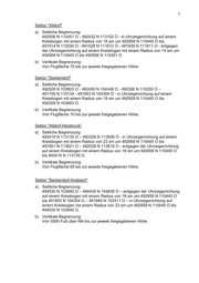 7 Sektor "Altdorf" a) Seitliche Begrenzung: 492506 N 112451 O - 492432 N 113102 O - in Uhrzeigerrichtung auf einem Kreisbogen mit einem Radius von 18 sm um 492959 N 110445 O bis 491514 N 112030 O - 491528 N 111812 O - 491939 N 111911 O - entgegen der Uhrzeigerrichtung auf einem Kreisbogen mit einem Radius von 14 sm um 492959 N 110445 O bis 492506 N 112451 O. b) Vertikale Begrenzung: Von Flugfläche 70 bis zur jeweils freigegebenen Höhe. Sektor "Seckendorf" a) Seitliche Begrenzung: 492528 N 103803 O - 492450 N 104448 O - 492306 N 110250 O – 491705 N 110134 - 491853 N 104304 O - in Uhrzeigerrichtung auf einem Kreisbogen mit einem Radius von 18 sm um 492959 N 110445 O bis 492528 N 103803 O. b) Vertikale Begrenzung: Von Flugfläche 70 bis zur jeweils freigegebenen Höhe. Sektor "Altdorf-Hersbruck“ a) Seitliche Begrenzung: 493419 N 113135 O – 493329 N 113938 O - in Uhrzeigerrichtung auf einem Kreisbogen mit einem Radius von 23 sm um 492959 N 110445 O bis 491951 N 113621 O – 492038 N 112818 O - entgegen der Uhrzeigerrichtung auf einem Kreisbogen mit einem Radius von 18 sm um 492959 N 110445 O bis 493419 N 113135 O. b) Vertikale Begrenzung: Von Flugfläche 65 bis zur jeweils freigegebenen Höhe. Sektor "Seckendorf-Ansbach" a) Seitliche Begrenzung: 494530 N 103840 O – 494435 N 104836 O – entgegen der Uhrzeigerrichtung auf einem Kreisbogen mit einem Radius von 18 sm um 492959 N 110445 O bis 491853 N 104304 O – 491949 N 103311 O – in Uhrzeigerrichtung auf einem Kreisbogen mit einem Radius von 23 sm um 492959 N 110445 O bis 494530 N 103840 O. b) Vertikale Begrenzung: Von 5500 Fuß über NN bis zur jeweils freigegebenen Höhe.