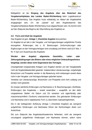 angegeben, vgl. § 62 VgV. Sofern bereits im Angebot Gründe geltend gemacht werden, die gegen eine Bekanntmachung sprechen, entscheidet die Kontaktstelle nach pflichtgemäßem Ermessen, vgl. § 62 Abs. 3 i.V.m. § 39 Abs. 6 VgV. 2.15 Bekanntmachung über vergebene Aufträge Mit der Abgabe seines Angebots erklärt sich der Bieter damit einverstanden, dass im Falle der Zuschlagserteilung auf sein Angebot unter den Voraussetzungen des § 39 Abs. 1-4 VgV sein Name und der zu zahlende Auftragspreis nach dem in Anhang III der Durchführungsverordnung (EG) Nr. 2015/1986 enthaltenen Muster bekannt gegeben wird. Sofern bereits im Angebot Gründe geltend gemacht werden, die gegen eine Bekanntmachung sprechen, entscheidet die Kontaktstelle nach pflichtgemäßem Ermessen, vgl. § 39 Abs. 6 VgV. 2.16 Vergütung Für die Teilnahme an der Ausschreibung wird keine Vergütung gewährt. Mit Abgabe eines Angebots verzichten die Bieter auf die Geltendmachung entstandener sowie evtl. entstehender Kosten. 2.17 Aufhebung der Ausschreibung Die Kontaktstelle behält sich unter den Voraussetzungen des § 63 VgV die teilweise oder vollständige Aufhebung der Ausschreibung vor. Die Aufhebung wird den Bietern schriftlich mitgeteilt. 2.18 Prüfung von Vergabesperren, Eintragungen im Wettbewerbsregister Es wird geprüft, ob gegen den Bieter, der für den Zuschlag vorgesehen ist, eine Meldung gemäß der Verwaltungsvorschrift zur Korruptionsverhütung und - bekämpfung bei der Melde- und Informationsstelle für Vergabesperren vorliegt. Bei Vorliegen einer Vergabesperre wird der Bieter vom weiteren Verfahren ausgeschlossen. Eine etwaige Zuschlagserteilung steht weiterhin unter dem Vorbehalt des Ergebnisses des Wettbewerbsregisterauszuges. Dieser wird nach § 6 Abs. 1 WRegG zur Validierung der Angaben von dem Bieter angefordert, der voraussichtlich den LZBW-2023-02-025 Vergabe- und Vertragsunterlagen Angebotsphase Seite 13 von 48