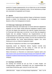 gesetzlichen Vorgaben dagegensprechen, bis zum Ablauf einer von der Kontaktstelle zu bestimmenden Nachfrist nachgefordert werden. Ob eine Nachforderung erfolgen wird, entscheidet die Vergabestelle nach Ermessen. 2.9 Sprache Der Bieter hat sein Angebot inklusive sämtlicher Anlagen und Nachweise in deutscher Sprache zu erstellen. Der Schriftverkehr mit dem Auftraggeber ist in deutscher Sprache zu führen. Die Vertragssprache ist deutsch. 2.10 Änderungen, Ergänzungen oder Rücknahme Nachträgliche Änderungen oder Ergänzungen von bereits elektronisch abgegebenen Angeboten sind nicht möglich. Bereits elektronisch abgegebene Angebote werden nicht durch die Abgabe eines geänderten oder ergänzten Angebots überschrieben. Um Änderungen oder Ergänzungen vorzunehmen, muss der Bieter das abgegebene Angebot über den jeweiligen Projektraum des Vergabeverfahrens auf dem Vergabemarktplatz des Landes Baden-Württemberg zurückziehen, ein neues Angebot mit den Änderungen oder Ergänzungen erstellen und erneut über das Bietertool des Vergabemarktplatzes des Landes Baden-Württemberg abgeben. Eine solche Änderung ist nur bis zum Ablauf der Angebotsfrist möglich. Nach Ablauf der Angebotsfrist ist der Bieter an sein Angebot gebunden. Systemseitig besteht die Möglichkeit mehrere Angebote innerhalb eines Vergabeverfahrens abzugeben. Ob dies zulässig ist, richtet sich nach den Bewerbungsbedingungen des konkreten Vergabeverfahrens. Nähere Informationen zur Rücknahme von elektronischen Angeboten stehen unter https://support.cosinex.de/unternehmen/pages/viewpage.action?pageId=28114987# Projektraum-Angebote/Teilnahmeantraege ElektronischeAngebotezurueckziehen zur Verfügung. 2.11 Zuschlags- und Bindefrist Der Zuschlag wird innerhalb der sich aus Punkt 1.8 dieser Vergabe- und Vertragsunterlagen ergebenden Zuschlagsfrist über den Vergabemarktplatz des Landes Baden-Württemberg, ggfs. vorab per Fax oder Email, erteilt. LZBW-2023-02-025 Vergabe- und Vertragsunterlagen Angebotsphase Seite 11 von 48