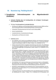 Inhaltsverzeichnis I. Management Summary 4 II. Rechtsänderungen 6 III. Bausteine (sog. "Building blocks") 10 1. Europäisches Informationssystem im Migrationsbereich (EURODAC) 10 1. Sachstand: Überblick über die Grundkapazitäten, die wichtigsten Verwaltungsakteure/zuständigen Behörden 10 2. Festlegung von Zielen 11 3. Anforderungen 13 4. Etappenziele (Meilensteine): 6 Monate, 12 Monate, 18 Monate 17 2. Asylgrenzverfahren /Überprüfung 17 1. Sachstand : Überblick über die Grundkapazitäten, die wichtigsten Verwaltungsakteure/zuständigen Behörden 17 2. Festlegung von Zielen 18 3. Anforderungen 20 4. Etappenziele (Meilensteine): 6 Monate, 12 Monate, 18 Monate 26 3. Aufnahme (einschließlich Vorintegrationsmaßnahmen, Inhaftnahme/Alternativen zur Inhaftnahme) 27 1. Sachstand: Überbl ick über die Grundkapazitäten, die wichtigsten Verwaltungsakteure/zuständigen Behörden 27 2. Festlegung von Zielen 32 3. Anforderungen 33 4. Etappenziele (Meilensteine): 6 Monate, 12 Monate, 18 Monate 34 4. Asylverfahren 35 1. Sachstand: Überblick über die Grundkapazitäten, die wichtigsten Verwaltungsakteure/zuständigen Behörden 35 2. Festlegung von Zielen 36 3. Anforderungen: 36 4. Etappenziele (Meilensteine): 6 Monate, 12 Monate, 18 Monate 38 5. Rückkehr/Rückführung 39 1. Sachstand: Überblick über die Grundkapazitäten, die wichtigsten Verwaltungsakteure/zuständigen Behörden 39 2. Festlegung von Ziele n 41 3. Anforderungen 41 4. Etappenziele (Meilensteine): 6 Monate, 12 Monate, 18 Monate 43 6. Durchführung der neuen Vorschriften zu V erantwortlichkeiten 44 1. Sachstand: Überblick über die Grundkapazitäten, die wichtigsten Verwaltungsakteure/zuständigen Behörden 44 2. Festlegung von Zielen 44