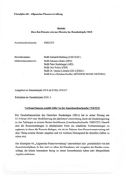Einzelplan 60 - Allgemeine Finanzverwaltung Bericht über den Einsatz externer Berater im Haushaltsjahr 2018 Ausschussdrucksache: 19(8)3252 Berichterstatter: MdB Eckhardt Rehberg (CDU/CSU) Mitberichterstatter/in: MdB Johannes Katers (SPD) MdB Peter Boehringer (AfD) MdB Otto Fricke (FDP) MdB Dr. Gesine Lötzsch (DIE LINKE.) MdB Sven-Christian Kindler (BÜNDNIS 90/DIE GRÜNEN) Ausgaben im Haushaltsjahr 2018 (in EUR): 393.617 Fall7Rhlen im Haushaltsjahr 2018: 5 Vorbemerkungen gemäß Ziffer 2a der Ausschussdrucksache 19(8)3252 Der Haushaltsausschuss des Deutschen Bundestages (HHA) hat in seiner Sitzung am 13. Februar 2019 eine Modifizierung der jährlichen Unterrichtung durch die Bundesregierung zu den Zahlungen an externe Berater beschlossen (Ausschussdrucksache 19(8)3252). Danach sind die Ressortmeldungen in tabellarischer Form tun inhaltliche Vorbemerkungen zu ergänzen, in denen die Ressorts darlegen, wie sie im Rahmen ihrer Ressortverantwortung mit dem Thema externe Berater umgehen und vor welchem Hintergrund die aktuellen Zahlen zu sehen sind. Der Einzelplan 60 „Allgemeine Finanzverwaltung" unterscheidet sich grundsätzlich von den Ressorteinzelplänen. In ihm sind vor allem die Einnahmen und Ausgaben des Bundes veran- schlagt, die keinen besonderen Bezug zu einem Ressortbereich haben oder übergreifende Aspekte aufweisen.