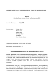 Erfassung der Zahlungen an externe Berater gem. Beschlüssen des HA vom 28.06.2006 und RPA vom 10.03.2017 Vertragsvolumen über 50.000 € Anlage 1 Kap./Titel (nur 9 Zahlen erfassen) a) Vertragszweck (stichwortartig) b) Benennung des Rahmenvertrags (ggf.) c) Normsetzung (ja/nein) d) Laufzeit (Monat/Jahr - Monat/Jahr) Name des Auftragnehmers / keine Zustimmung zur Namensnennung Aus- schrei- bung (ja/nein) Vertrags- volumen in EUR Honorar nach Aufwand/ Stunden Ga) Ausgaben in 2019 in EUR Verpflichtungen in EUR (nur Zahlen) Summe G bis J 2020 2021 2022 1112 532 01 a) Verbindliche Realisierung des Projektes "IT- Konsolidierung Bund - Umsetzungsbegleitung" b) EA 3269 aus RV 2875 3PM BVA c) Nein d) 07/2017 - 12/2019 keine Zustimmung zur Namensnennung Nein 204.204 Ja 131.115 0 0 0 131.115 1112 532 01 a) b) c) d) 01/2017 - 12/2020 keine Zustimmung zur Namensnennung Nein 89.145 Ja 0 0 1114 532 01 a) Beratung und Unterstüzung bei der Entwicklung und Implementierung eines webbasierten, wissensgesteuerten Elektronischen Rechtsverkehrs 2.0 im Bundeesarbeitsgericht (ERV 2.0) b) Abruf aus RV 2907 BVA c) nein d) Laufzeit (04/2015 bis 12/2019) keine Zustimmung zur Namensnennung Abruf aus Rahmenv ertrag 380.800 ja 23.354 0 0 0 23.354 1115 539 99 a) Führungskräfte -Feedback b) c) nein d) 04/2018 - 04/2019 keine Zustimmung zur Namensnennung nein, Rahmen- vertrag BVA 71.924 nein 56.358 56.358 2 von 2 Erfassung der Zahlungen an externe Berater gem. Beschlüssen des HA vom 28.06.2006 und RPA vom 10.03.2017 Vertragsvolumen über 50.000 €Anlage 1 Kap./Titel (nur 9 Zahlen erfassen)a) Vertragszweck (stichwortartig) b)Benennung des Rahmenvertrags (ggf.) c) Normsetzung (ja/nein) d) Laufzeit (Monat/Jahr - Monat/Jahr)Name des Auftragnehmers / keine Zustimmung zur NamensnennungAus- schrei- bung (ja/nein)Vertrags- volumen in EURHonorar nach Aufwand/ Stunden (ja)Ausgaben in 2019 in EURSumme G bis J 2020 2021 2022Verpflichtungen in EUR (nur Zahlen) 1112 532 01 a) Verbindliche Realisierung des Projektes "IT- Konsolidierung Bund - Umsetzungsbegleitung" b) EA 3269 aus RV 2875 3PM BVA c) Nein d) 07/2017 - 12/2019keine Zustimmung zur Namensnennung Nein 204.204 Ja 131.115 0 0 0 131.115 1112 532 01 a) b) c) Nein d) 01/2017 - 12/2020keine Zustimmung zur Namensnennung Nein 89.145 Ja 0 0 1114 532 01 a) Beratung und Unterstüzung bei der Entwicklung und Implementierung eines webbasierten, wissensgesteuerten Elektronischen Rechtsverkehrs 2.0 im Bundeesarbeitsgericht (ERV 2.0) b) Abruf aus RV 2907 BVA c) nein d) Laufzeit (04/2015 bis 12/2019)keine Zustimmung zur Namensnennung Abruf aus Rahmenv ertrag380.800 ja 23.354 0 0 0 23.354 1115 539 99 a) Führungskräfte-Feedback b) c) nein d) 04/2018 - 04/2019keine Zustimmung zur Namensnennung nein, Rahmen- vertrag BVA71.924 nein 56.358 56.358 2 von 2