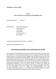 Einzelplan 30 / Ressort:BMBF Bericht über den Einsatz externer Berater im Haushaltsjahr 2019 Ausschussdrucksache: 19(8)3252 Berichterstatter: Bettina Stark-Watzinger Kerstin Radomski Swen Schulz Marcus Bühl Dr. Gesine Lötzsch Ekin Deligöz Ausgaben im Haushaltsjahr 2019 (in EUR): 1.078.008 € Fallzahlen im Haushaltsjahr 2019: 19 Vorbemerkungen gemäß Ziffer 2a der Ausschussdrucksache 19(8)3252 Das Bundesministerium für Bildung und Forschung nimmt externen Sachverstand in Anspruch, wenn dies erforderlich ist, um die entsprechende Expertise im Haus zu ergänzen. Dies betrifft insbesondere einzelne Aspekte zur Umsetzung im Bereich Digitalisierung und digitale Verwaltung, aber auch Rechtsberatung im Zusammenhang mit Einzelaspekten aus den Bereichen Sprunginnovation und der Weiterentwicklung des Berliner Instituts für Gesundheitsforschung, aber auch Rechtsberatung im Rahmen internationaler Verhandlungen. Das Haus nimmt für diese rechtlich wie organisatorisch hochkomplexen Sachverhalte, die zudem einem stetigen Wandel unterliegen, die Unterstützung von entsprechenden Spezialisten in Form von externen Beratern in Anspruch. Die Vergabe von Beraterleistungen erfolgt im Rahmen eines wettbewerblichen Verfahrens. Die Vergabe eines Auftrags an ein Unternehmen setzt im Vorfeld eine Bedarfsfeststellung und eine Wirtschaftlichkeitsuntersuchung voraus, in der das BMBF feststellt, dass die Vergabe des Auftrags notwendig ist und der Bedarf nicht mit eigenen Ressourcen gedeckt werden kann. Einzelplan 30 / Ressort:BMBF Bericht über den Einsatz externer Berater im Haushaltsjahr 2019 Ausschussdrucksache: 19(8)3252 Berichterstatter: Bettina Stark -Watzinger Kerstin Radomski Swen Schulz Marcus Bühl Dr. Gesine Lötzsch Ekin Deligöz Ausgaben im Haushaltsjahr 2019 (in EUR): 1.078.008 € Fallzahlen im Haushaltsjahr 2019: 19 Vorbemerkungen gemäß Ziffer 2a der Ausschussdrucksache 19(8)3252 Das Bundesministerium für Bildung und Forschung nimmt externen Sachverstand in Anspruch, wenn dies erforderlich ist, um die entsprechende Expertise im Haus zu ergänzen. Dies betrifft insbesondere einzelne Aspekte zur Umsetzung im Bereich Digitalisierung und digitale Verwaltung, aber auch Rechtsberatung im Zusammenhang mit Einzelaspekten aus den Ber eichen Sprunginnovation und der Weiterentwicklung des Berliner Instituts für Gesundheitsforschung, aber auch Rechtsberatung im Rahmen internationaler Verhandlungen. Das Haus nimmt für diese rechtlich wie organisatorisch hochkomplexen Sachverhalte, die zude m einem stetigen Wandel unterliegen, die Unterstützung von entsprechenden Spezialisten in Form von externen Beratern in Anspruch. Die Vergabe von Beraterleistungen erfolgt im Rahmen eines wettbewerblichen Verfahrens. Die Vergabe eines Auftrags an ein Unter nehmen setzt im Vorfeld eine Bedarfsfeststellung und eine Wirtschaftlichkeitsuntersuchung voraus, in der das BMBF feststellt, dass die Vergabe des Auftrags notwendig ist und der Bedarf nicht mit eigenen Ressourcen gedeckt werden kann.