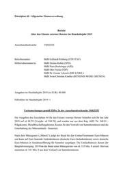 Erfassung der Zahlungen an externe Berater gem. Beschlüssen des HA vom 28.06.2006 und RPA vom 10.03.2017 Vertragsvolumen über 50.000 € Anlage 1 A B C D E F G H I 1 I J K Kap./Titel (nur 9 Zahlen erfassen) a) Vertragszweck (stichwortartig) b) Benennung des Rahmenvertrags (ggf.) c) Normsetzung (ja/nein) d) Laufzeit (Monat/Jahr - Monat/Jahr) Name des Auftragnehmers / keine Zustimmung zur Namensnennung Aus- schrei- bung (ja/nein) Vertrags- volumen in EUR Honorar nach Aufwand/ Stunden (ja) Ausgaben in 2019 in EUR Verpflichtungen in EUR (nur Zahlen) Summe G bis J 2020 2021 2022 6002 540 01 a) Vergaberechtliche Beratung und Begleitung der Ausschreibung für Vertriebs- und Marketingleistungen beim Vertrieb von Münzen und Münzprodukten b) - c) nein d) 10/2014 - bis zur Beendigung des unterstützten Projekts Müller-Wrede & Partner ja ca. 200.000 ja 80.000 70.000 150.000 1 von 1 Erfassung der Zahlungen an externe Berater gem. Beschlüssen des HA vom 28.06.2006 und RPA vom 10.03.2017 Vertragsvolumen über 50.000 €Anlage 1 A B C D E F G H I J K Kap./Titel (nur 9 Zahlen erfassen)a) Vertragszweck (stichwortartig) b)Benennung des Rahmenvertrags (ggf.) c) Normsetzung (ja/nein) d) Laufzeit (Monat/Jahr - Monat/Jahr)Name des Auftragnehmers / keine Zustimmung zur NamensnennungAus- schrei- bung (ja/nein)Vertrags- volumen in EURHonorar nach Aufwand/ Stunden (ja)Ausgaben in 2019 in EURSumme G bis J 2020 2021 2022 6002 540 01 a) Vergaberechtliche Beratung und Begleitung der Ausschreibung für Vertriebs- und Marketingleistungen beim Vertrieb von Münzen und Münzprodukten b) - c) nein d) 10/2014 - bis zur Beendigung des unterstützten ProjektsMüller-Wrede & Partner ja ca. 200.000 ja 80.000 70.000 150.000Verpflichtungen in EUR (nur Zahlen) 1 von 1