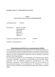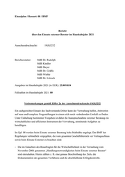 Einzelplan / Ressort: 08 / BMF Bericht über den Einsatz externer Berater im Haushaltsjahr 20 21 Ausschussdrucksache: 19(8)32 52 Berichterstatter: MdB Dr. Rudolph MdB Kindler MdB Meyer MdB Dr. Gräßle MdB Wiehle MdB Dr. Lötzsch Ausgaben im Haushaltsjahr 20 21 (in EUR): 25.809.854 Fallzahlen im Haushaltsjahr 20 21: 80 Vorbemerkungen gemäß Ziffer 2a der Ausschussdrucksache 19(8)3252 Ein sachgerechter Einsatz des Sachverstands Dritter kann der Verwaltung helfen, Antworten auf neue und komplexe Fragestellungen in einem sich rasch verändernden Umfeld zu finden. Unter Einhaltung bestimmter Vorgaben ist daher die Inanspruchnahme externer Beratung ein wirtschaftliches und effizientes Instrument der Verwaltung, anstehende Aufgaben zu bewältigen. Im Epl. 08 werden beim Einsatz externer Beratung hohe Maßstäbe angelegt. Das BMF hat Regelungen verbindlich vorgegeben, die vom gesamten Geschäftsbereich vor Vertragsschluss sowie beim Einsatz Externer zu beachten sind: -Die im Gutachten des Beau ftragten für die Wirtschaftlichkeit in der Verwaltung vom November 2006 genannten „Handlungsnotwendigkeiten beim Einsatz externer Berater“ sind einzuhalten. Hierzu zählen z. B. eine genaue Beschreibung des Ziels, die Dokumentation des gesamten Verfahrens u nd die abschließende Erfolgskontrolle.