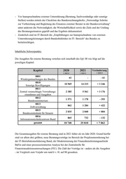 -Vor Inanspruchnahme externer Unterstützung (Beratung, Sachverständige oder sonstige Stellen) werden mittels der Checkliste des Bundesrechnungshofes „Notwendige Schritte zur Vorbereitung und Begleitung des Einsatzes ex terner Berater in der Bundesverwaltung“ unter anderem die Notwendigkeit, die Wirtschaftlichkeit sowie die Ziele und der Umfang des Beratungseinsatzes geprüft und das Ergebnis dokumentiert. -Zusätzlich sind im IT -Bereich die „Empfehlungen zur Inanspruchnahme von externen Unterstützungsleistungen durch Bundesbehörden im IT - Bereich“ des Bundes zu berücksichtigen. Inhaltliche Schwerpunkte: Die Ausgaben für externe Beratung verteilen sich innerhalb des Epl. 08 wie folgt auf die jeweiligen Kapitel: Kapitel 2020 1 000 €2021 1 000 €Veränderung 1 000 € 0801 Wiedergutmachungen des Bundes 61 - - 61 0810 Sonstige Bewilligungen 10 969 14 215 + 3 2460811 Zentral veranschlagte Verwaltungs - einnahmen und Ausgaben 2 385 5 561 +3 1760812 Bundesministerium 1 571 1 178 -3930813 Zollverwaltung 862 1 284 + 4220815 Bundeszentralamt für Steuern 2 035 2 840 +8040816 Informationstechnikzentrum Bund 865 732 -132gesamt 18 748 25 810 +7 062Die Gesamtausgaben für externe Beratung sind in 2021 höher als im Jahr 2020. Grund hierfür sind vor allem drei größere, neue Beratungsverträge im Bereich der Projektunterstützung bei der IT -Betriebskonsolidierung Bund, der Modernisierung der Finanzdienstle istungsaufsicht BaFin und einer prozessorientierten Analyse bei der Zentralstelle für Finanztransaktionsuntersuchungen (FIU). Die Zahl der Verträge ist - anders als die Ausgaben -im Vergleich zum Vorjahr um rund 6 v. H. auf 80 gesunken.