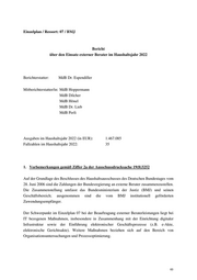 Einzelplan / Ressort: 08 / BMF Bericht über den Einsatz externer Berater im Haushaltsjahr 2022 Berichterstatter: MdB Dr. Rudolph M d B K i n d l e r M d B M e y e r M d B D r . G r ä ß l e M d B W i e h l e M d B D r . L ö t z s c h Ausgaben im Haushaltsjahr 2022 (in EUR): 31.060.534 Fallzahlen im Haushaltsjahr 2022: 78 1. Vorbemerkungen gemäß Ziffer 2a der Ausschussdrucksache 19(8)325 2 Mit Maßgabebeschluss vom 15. November 2023 (Ausschussdrucksache 20(8)5015) hat der Haushaltsausschuss des Deutschen Bundestages seine Maßgabebesch lüsse zu externen Beratungsleistungen (13. Februar 2019, Ausschussdrucksache 19(8)3252 sowie 9. Juni 2021, Ausschussdrucksache 19(8)8703) bekräftigt. Neben einer Erw eiterung der im Bericht der Bundesregierung zu den Ausgaben im Bundeshaushalt aufgrund der Inanspruchnahme externer Beratungsleistungen zu erfassenden Angaben werden auch neue inhaltliche Vorgaben für den Abschluss der Verträge mit externen Beratern g emacht. Im dritten Spiegel- punkt enthält der Maßgabebeschluss die Aufforderung zur Vorlage einer Strategie zum Aufbau eigener Kompetenzen für w iederkehrenden Beratungsbedarf und wie dadurch externe Beratungsleistungen insbesondere in der IT abgebaut werden könn en: „Im Bericht über die Erfassung der Zahlungen für externe Beratungsleistungen im Haushalts- jahr 2022 ist eine Strategie vorzulegen, wie eigene Kompetenzen für wiederkehrenden Beratungsbedarf in den Ressorts, insbesonde re in der IT, aufgebaut und dadurch externe Beratungsleistungen abgebaut werden können. Der Bericht sollte auch darauf eingehen, inwiefern derzeitig in Anspruch genommene externe Beratungsleist ungen die Ressorts zu einer eigenständigen Fortsetzung der Aufgabe n befähigen oder von wiederkehrenden 72