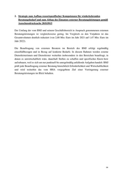 2. Strategie zum Aufbau ressortspezifischer Kompetenzen für wiederkehrenden Beratungsbedarf und zum Abbau des Einsatzes externer Beratungsleistungen gemäß Ausschussdrucksache 20(8) 5015 Der Umfang der vom BMJ und seinem Geschäftsbereich in Anspruch genommenen externen Beratungsleistungen ist vergleichsweise gering. Im Vergleich zu den Vorjahren ist das Gesamtvolumen deutlich reduziert (von 2,88 Mio. Euro im Jahr 2021 auf 1,47 Mio. Euro im Jahr 2022). Die Beauftragung von externen Beratern im Bereich des BMJ erfolgt regelmäßig einzelfallbezogen und in Bezug auf konkrete Bedarfe. In diesem Rahmen werden externe Dienstleisterinnen und Dienstleister weiterhin insbesondere in den Bereichen bea uftragt, in denen es unwirtschaftlich wäre, dauerhaft Stellen zu schaffen und spezifisches Know -how aufzubauen, weil es sich um nur punktuell bis unregelmäßig anfallende Aufgaben handelt. BMJ prüft jede Beauftragung externer Beratung hinsichtlich Erforderl ichkeit und Wirtschaftlichkeit und wird weiterhin das vom HHA vorgegebene Ziel einer Verringerung externer Beratungsleistungen im Blick behalten. 64