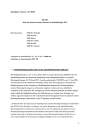 Einzelplan / Ressort: 08 / BMF Bericht über den Einsatz externer Berater im Haushaltsjahr 2022 Berichterstatter: MdB Dr. Rudolph M d B K i n d l e r M d B M e y e r M d B D r . G r ä ß l e M d B W i e h l e M d B D r . L ö t z s c h Ausgaben im Haushaltsjahr 2022 (in EUR): 31.060.534 Fallzahlen im Haushaltsjahr 2022: 78 1. Vorbemerkungen gemäß Ziffer 2a der Ausschussdrucksache 19(8)325 2 Mit Maßgabebeschluss vom 15. November 2023 (Ausschussdrucksache 20(8)5015) hat der Haushaltsausschuss des Deutschen Bundestages seine Maßgabebesch lüsse zu externen Beratungsleistungen (13. Februar 2019, Ausschussdrucksache 19(8)3252 sowie 9. Juni 2021, Ausschussdrucksache 19(8)8703) bekräftigt. Neben einer Erw eiterung der im Bericht der Bundesregierung zu den Ausgaben im Bundeshaushalt aufgrund der Inanspruchnahme externer Beratungsleistungen zu erfassenden Angaben werden auch neue inhaltliche Vorgaben für den Abschluss der Verträge mit externen Beratern g emacht. Im dritten Spiegel- punkt enthält der Maßgabebeschluss die Aufforderung zur Vorlage einer Strategie zum Aufbau eigener Kompetenzen für w iederkehrenden Beratungsbedarf und wie dadurch externe Beratungsleistungen insbesondere in der IT abgebaut werden könn en: „Im Bericht über die Erfassung der Zahlungen für externe Beratungsleistungen im Haushalts- jahr 2022 ist eine Strategie vorzulegen, wie eigene Kompetenzen für wiederkehrenden Beratungsbedarf in den Ressorts, insbesonde re in der IT, aufgebaut und dadurch externe Beratungsleistungen abgebaut werden können. Der Bericht sollte auch darauf eingehen, inwiefern derzeitig in Anspruch genommene externe Beratungsleist ungen die Ressorts zu einer eigenständigen Fortsetzung der Aufgabe n befähigen oder von wiederkehrenden 72