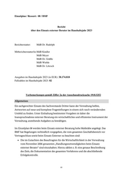 Einzelplan / Ressort: 08 / BMF Bericht über den Einsatz externer Berater im Haushaltsjahr 2023 Berichterstatter: MdB Dr. Rudolph Mitberichterstatter/in: MdB Kindler MdB Meyer MdB Dr. Gräßle MdB Wiehle MdB Dr. Lötzsch Ausgaben im Haushaltsjahr 2023 (in EUR): 38.174.818 Fallzahlen im Haushaltsjahr 20 23: 82 Vorbemerkungen gemäß Ziffer 2a der Ausschussdrucksache 19(8)3252 Allgemeines Ein sachgerechter Einsatz des Sachverstands Dritter kann der Verwaltung helfen, Antworten auf neue und komplexe Fragestellungen in einem sich rasch verändernden Umfeld zu finden. Unter Einhaltung bestimmter Vorgaben ist daher die Inanspruchnahme externer Beratung ein wirtschaftliches und effizientes Instrument der Verwaltung, anstehende Aufgaben zu bewältigen. Im Einzelplan 08 werden beim Einsatz externer Beratung hohe Maßstäbe angelegt. Das BMF hat Regelungen verbindlich vorgegeben, die vom gesamten Geschäftsbereich vor Vertrags schluss sowie beim Einsatz Externer zu beachten sind: • Die im Gutachten des Beauftragten für die Wirtschaftlichkeit in der Verwaltung vom November 2006 genannten „Handlungsnotwendigkeiten beim Einsatz externer Berater“ sind einzuhalten. Hierzu zählen z. B. eine genaue Beschreibung des Ziels, die Dokumentation des gesamten Verfahrens und die abschließende Erfolgskontrolle. 61