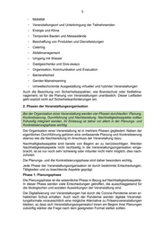 3 - Mobilität - Veranstaltungsort und Unterbringung der Teilnehmenden - Energie und Klima - Temporäre Bauten und Messestände - Beschaffung von Produkten und Dienstleistungen - Catering - Abfallmanagement - Umgang mit Wasser - Gastgeschenke und Give -aways - Organisation, Kommunikation und Evaluation - Barrierefreiheit - Gender -Mainstreaming - Umweltschonende Ausgestaltung virtueller und hybrider Veranstaltungen Auch die Beachtung von Sicherheitsaspekte n, wie Brandschutz oder Notfallma - nagement, ist für die Planung von Veranstaltungen unerlässlich. Dieser Leitfaden geht explizit nicht auf Sicherheitsanforderungen ein. 2. Phasen der Veranstaltungsorganisation Bei der Organisation einer Veranstaltung werden vier Phasen durchlaufen: Planung, Konkretisierung, Durchführung und Nachbereitung. Nachhaltigkeitsaspekte sollten frühzeitig integriert werden, ihr Einbezug ist daher vor allem in der Planungs - und Konkretisierungsphase wichtig. Die Organisation einer Veranstaltung ist in mehrere Phasen gegliedert. Neben der eigentlichen Durchführung gehören eine umfassende Planung und Konkretisierung ebenso wie die Nachbereitung im Anschluss der Veranstaltung dazu. Nachhaltigkeitsaspekte sind bereits von Beginn an zu berücksichtigen. Werden Nachhaltigkeitsaspekte nicht rechtzeitig in die Veranstaltungsorganisation einge - bracht, ist es nur noch sehr schwierig oder mitunter nicht mehr möglich, dies nach - zuholen. Die Planungs - und die Konkretisierungsphase sind daher besonders wichtig. Jede Phase der Veranstaltungsorganisation ist durch bestimmte Entscheidungen, Tätigkeiten und zu beachtende Aspekte geprägt. Phase 1: Planungsphase Die Planungsphase ist die wesentliche Phase in Bezug auf Nachhaltigkeitsaspek te. In dieser Phase werden viele Entscheidungen getroffen, die ausschlaggebend für die ökologischen und sozialen Auswirkungen der Veranstaltung sind. Die Digitalisierung von Veranstaltungen hat durch die Corona -Pandemie einen er - heblichen Schub erhalten. Au ch nach der Pandemie werden digitale Veranstal - tungsformate voraussichtlich eine mögliche Alternative zu Präsenzveranstaltungen bleiben, so dass sich Veranstaltungsorganisator/ -innen am Beginn ihrer Planungen zukünftig stärker die Frage nach dem geeigneten Format stellen sollten.