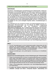 11 • Maßnahmen angrenzender Handlungsfelder berücksichtigen EINFÜHRUNG Der Bereich „Veranstaltungsort und Unterbringung der Teilnehmenden“ umfasst An - forderungen an die Konferenzgebäude und Hotels sowie Aspekte der vorgesehe - nen Rahmenveranstaltungen. Bei der Auswahl der Hotels und Konferenzgebäude und der Durchführung von Veranstaltungen spielen Fragen des Abfa llmanage - ments, der Beschaffung, des Energieverbrauchs, des Bedarfs an temporären Bau - ten, der Mobilität, der Versorgung und des Wasserverbrauchs eine wichtige Rolle. Diese Themen werden in den entsprechenden Kapiteln getrennt dargestellt. Beson - ders hingewie sen sei auf das Handlungsfeld Mobilität, da die An - und Abreise sowie die Mobilität vor Ort zu den wichtigsten Aspekten zählen, Umweltbelastungen zu reduzieren. Eine Hilfestellung bei der Auswahl der Hotels und Konferenzgebäude können um - weltbezogene Kennze ichnungen, wie zum Beispiel die EMAS - Registrierung (https://www.emas -register.de/ ) oder das Europäische Umweltzeichen (https:// www.eu -ecolabel.de/ ), sein. So gekennzeichnete Standorte sind besonders geeignet, da die Hotelbetreibenden und Veranstalter die Einhaltung von Umweltan - forderungen nachweisen müssen. Auch das Vorhandensein eines Umw elt- oder Energiemanagementsystems nach den Normen ISO 14001 und ISO 50001 bele - gen, dass sich die Betreibenden des Hotels bzw. Veranstaltungsortes mit ihren Um- weltauswirkungen auseinandersetzen. Ferner können auf Hotelbuchungsportalen Hotels mitunter gezie lt nach Nachhaltigkeitskriterien recherchiert werden (z. B. https://www.bookdifferent.com/en/ ). Das Travel Management System (TMS) des Bundes bietet eine Suchoption, mit der nach Hotels mit einer Umweltzertifizierung gesucht werden kann. Ferner thematisiert dieses Handlungsfeld die Orga nisation und Durchführung von Rahmenveranstaltungen unter Nachhaltigkeitsges ichtspunk - ten. ZIELE → Für den Veranstaltungsort und die Unterbringung gelten insbesondere die Ziel - stellungen der Handlungsfelder „Mobilität“, „Energie und Klima“, „Temporäre Bauten“, „Beschaffung von Produkten und Dienstleistungen“, „Catering“, „Abfall - management“, „Umgang mit Wasser“ und „Barrierefreiheit“ → Rahmenveranstaltungen unter größtmöglicher Vermeidung von Umweltbelas - tungen MASSNAHMEN Auswahl des Veranstaltungsortes und der Unterbringung der Teilnehmenden → Hotels und Kongresszentren mit einem Umweltmanagementsystem auswählen. Diese sollten nach EMAS validiert und registriert sein. Hotels, die ökologische Kriterien erfüllen, können auch mit dem Europäischen Umweltzeichen gekenn - zeichnet sein. Diese oder eine gleichwertige Kennzeichnung sowie gleichwer - tige Managementsysteme können bei der Auswahl berücksichtigt werden → Hotels in Buchungsportalen insbesondere nach Nachhaltigkeitsgesichtspunk - ten recherchieren → Es gelten des Weiteren insbesondere die Maßnahmen der Handlungsfelder „Mobilität“, „Energie und Klima“, „Temporäre Bauten“, „Beschaffung von