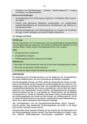 12 Produkten und Dienstleistungen“, „Catering“, „Abfallmanagement“, „Umgang mit Wasser“ und „Barrierefreiheit“ Rahmenveranstaltungen → Veranstaltungsort und Unterbringung möglichst in unmittelbarer Nähe zueinan - der wählen → Fahrten unter Benutzung öffentlicher Verkehrsmittel, von Leihfahrrädern und/oder Bereitstellung von emissionsarmen Shuttlebussen; ggf. Bildung von Fahrgemeinschaften → Rahmenveranstaltungen unter Berücksichtigung von Umwelt - und Sozialkrite - rien (ggf. umwelt - bezogene und soziale Projekte einbeziehen) 3.3. Energie und Klima Einführung Bei der Organisation von Veranstaltungen wird eine größtmögli che Energieeffizienz und Energieeinsparung angestrebt. Das betrifft zum Beispiel die Mobilität vor Ort so- wie das Heizen, Kühlen und die Veranstaltungstechnik in der Location. Ziele • Energieverbrauch eindämmen • Energieeffizienz steigern • Treibhausgasemissionen reduzieren/ vermeiden Maßnahmen • Nicht über 20 Grad heizen/nicht mehr als 6 Grad unter Außentemperatur kühlen • Strom aus erneuerbaren Quellen beziehen • IT-Geräte mit „Blauer -Engel“ -Zertifizierung verwenden EINFÜHRUNG Die Reduzierung des Energieverbrauchs und die Steigerung der Energieeffizienz sind große Stellschrauben, um eine Veranstaltung nachhaltig zu gestalten. Das Handlungsfeld „Energie und Klima“ spielt als übergeordnetes Thema zum Bei - spiel bei der Mobilität und der Auswahl der Konferenzgebäude und Hotels am Ver - anstaltungsort eine entscheidende Rolle. Die eigenständige Behandlung soll die umweltpolitische Bedeutung des Themas unterstreichen und den Blick der Organi - satorinnen und Organisatoren hierauf schärfen. Klimabeeinflussende Energiever - bräuche entstehen bei der An - und Abreise der Teilnehmenden, bei der Mobilität am Konferenzort (s. Kapitel 3.1 Mobilität), beim Heizen, Kühlen und der Beleuchtung der Konferenzgebäude und Hotels und dem Einsatz von Konferenztech nik. Ziel ist es, diese Energieverbräuche zu minimieren. Insbesondere werden Maßnahmen ge - nannt, die zu einem sparsamen Stromverbrauch beitragen. Den Veranstaltenden sind bei Energieeinsparmaß nahmen jedoch Grenzen dadurch gesetzt, dass bestehende Konferen zgebäude und Hotels in der Regel kaum baulich verändert werden können. Deshalb sollten diese Aspekte frühzeitig bei der Auswahl des Konferenzortes und der Konferenzgebäude bedacht werden. Eine Berücksichtigung ist möglich, wenn zum Beispiel EMAS -registrier te Einrichtungen ausgewählt werden. Das