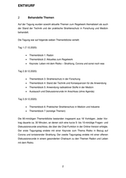 ENTWURF 2 Behandelte Themen Auf der Tagung wurden sowohl aktuelle Themen zum Regelwerk thematisiert als auch der Stand der Technik und der praktische Strahlenschutz in Forschung und Medizin behandelt. Die Tagung war auf folgende sieben Themenblöcke verteilt: Tag 1 (7.12.2020) : • Themenblock 1: Radon • Themenblock 2: Aktuelles zum Regelwerk • Keynote: Leben mit dem Risiko – Strahlung, Corona und sonst noch was Tag 2 (8.12.2020) : • Themenblock 3: Strahlenschutz in der Forschung • Themenblock 4: Stand der Technik und Konsequenzen für die Anwendung • Themenblock 5: Anwendung radioaktiver Stoffe in der Medizin • Austausch und Diskussionsrunde im Anschluss (ohne Agenda) Tag 3 (9.12.2020) : • Themenblock 6: Praktischer Strahlenschutz in Mediz in und Industrie • Themenblock 7 (sonstige Themen) Die 90-minütigen Themenblöcke bestanden insgesamt aus 18 Vorträgen. Jeder Vor- trag dauerte ca. 30 Minuten, an denen sich eine kurze 5 - bis 10- minütige Fragen- und Diskussionsrunde anschloss, die über die Chat -Funktion in der Online- Version erfolgte. Der erste Tagungstag endete mit einer Keynote zum Thema Risiko in Bezug auf Corona und ionisierender Strahlung. Der zweite Tagungstag endete mit einer offenen Diskussionsrunde in einem gesonderten Chatraum zu den Themen Radon und Leben mit dem Risiko.