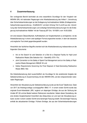 29 4 Zusammenfassung Der vorliegende Bericht beinhaltet als eine wesentliche Grundlage für den Vergleich der WENRA SRL mit nationalen Regelungen eine Arbeitsübersetzung des Artikel 1 „Verordnung über Sicherheitsanforderungen an die Endlagerung hochradioaktiver Abfälle (Endlagersicher-heitsanforderungsverordnung – EndlSiAnfV)“ und dem Anhang Teil A und B aus der „Verord- nung über Sicherheitsanforderungen und vorläufige Sicherheitsuntersuc hungen für die Endla- gerung hochradioaktiver Abfälle“ mit der Fassung (BT- Drs. 19/19291) vom 18.05.2020 . Um eine bessere Überprüf barkeit , Auffind barkeit und Vergleichbarkeit zu ermöglichen, ist die Arbeitsübersetzung in einem zwei -spaltigen Format angeordnet worden, in dem der deutsche und englische Text direkt gegenübergestellt wurden . Hinsichtlich der fachlichen Begriffe orientiert sich die Arbeitsübers etzung insbesondere an die folgenden Dokumente: • Act on the Search for and Selection of a Site for a Disposal Facility for High- Level Radioactive Waste (Site Selection Act – StandAG) /STA 17b/, • Joint Convention on the Safety of Spent Fuel Management and on the Safety of Radi- oactive Waste Management /BMUB 18/ und • Safety Requirements Governing the Final Disposal of Heat -Generating Radioactive Waste /BMU 10b/. Die Arbeitsübersetzung dient ausschließlich als Grundlage für die anstehende Aufgabe der Selbsteinschätzung im Zusammenhang mit den WENRA SRL und der entsprechenden natio- nalen Regelungen. Hinsichtlich der Aktualisierung der Selbsteinschätzung wurde auf die Excel Tabelle bzw. Datei von 2017 als Arbeitsgrundlage zurückgegriffen /BMU 17/. In einem ersten Schritt wurde das originale Excel -Arbeitsblatt „SRL“ ergänzt um diejenigen Einträge, die aus der Sichtung der Inhalte /BT 20/ und bei Bedarf weiterer Referenzen resultier ten. Neben dieser Darstellung, die eine direkte Vergleichbarkeit hinsichtlich des Zeitpunktes vor und nach der Aktualisierung er-laubt, wurde in einem zweiten Schritt eine bereinigte Fassung erstellt . Die bereinigte Fassung enthält die aktualisierten Einträge. Frühere Einträge, die aus den Sicherheitsanforderungen