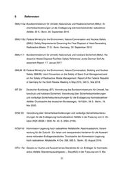 30 /BMU 10a/ zitiert wurden und/oder Einträge, die aufgrund geänderter Regelungen keine Gül- tigkeit mehr haben, sind in der bereinigten Fassung gelöscht worden. Eine Klassifizierung in die Klassen A, B und C, inwieweit sich die entsprechende SRL im nationalen Regelwerk wie- derspiegelt, wurde nicht vorgenommen, da diese Einschätzung dem BMU vorbehalten ist. Sowohl die vorliegende Arbeitsübersetzung als auch die Aktualisierung zur Selbsteinschät- zung wurden im Rahmen des Vorhabens 4717E03210 „Fachberatung des BMU bei wissen- schaftlichen und technischen Fragestellungen im Zusammenhang mit der Endlagerung und Standortauswahl“ durchgeführt.
