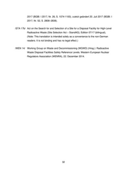 32 2017 (BGBl. I 2017, Nr. 26, S. 1074 -1100), zuletzt geändert 20. Juli 2017 (BGBl. I 2017, Nr. 52, S. 2808– 2838). /STA 17b/ Act on the Search for and Selection of a Site for a Disposal Facility for High- Level Radioactive Waste (Site Selection Act – StandAG) , Edition 07/17 (bilingual) , (Note: This translation is intended solely as a convenience to the non- German readers. It is not binding and has no legal effect. ) /WEN 14/ Working Group on Waste and Decommissioning (WGWD) (Hrsg.): Radioactive Waste Disposal Facilities Safety Reference Levels. Western European Nuclear Regulators Association (WENRA), 22. Dezember 2014.