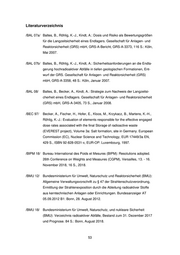 53 Literaturverzeichnis /BAL 07a/ Baltes, B., Röhlig, K. -J., Kindt, A.: Dosis und Risiko als Bewertungsgrößen für die Langzeitsicherheit eines Endlagers. Gesellschaft für Anlagen - und Reaktorsicherheit (GRS) mbH, GRS -A-Bericht, GRS -A-3373, 116 S.: Köln, Mai 2007. /BAL 07b/ Baltes, B., Röhlig, K. -J., Kindt, A.: Sicherheitsanforderungen an die Endla- gerung hochradioaktiver Abfälle in tiefen geologi schen Formationen, Ent- wurf der GRS. Gesellschaft für Anlagen- und Reaktorsicherheit (GRS) mbH, GRS -A-3358, 48 S.: Köln, Januar 2007. /BAL 08/ Baltes, B., Becker, A., Kindt, A.: Strategie zum Nachweis der Langzeitsi- cherheit eines Endlagers. Gesellschaft für Anlagen- und Reaktorsicherheit (GRS) mbH, GRS -A-3405, 73 S., Januar 2008. /BEC 97/ Becker, A., Fischer, H., Hofer, E., Kloos, M., Krzykacz, B., Martens, K. -H., Röhlig, K. -J.: Evaluation of elements responsible for the effective engaged dose rates associat ed with the final Storage of radioactive waste (EVEREST project), Volume 3a: Salt formation, site in Germany. European Commission (EC), Nuclear Science and Technology, EUR 17449/3a EN, 429 S., ISBN 92- 828-0531- x, EUR -OP: Luxembourg, 1997. /BIPM 18/ Bureau International des Poids et Mesures (BIPM): Resolutions adopted. 26th Conference on Weights and Measures (CGPM), Versailles, 13. - 16. November 2018, 16 S., 2018. /BMU 12/ Bundesministerium für Umwelt, Naturschutz und Reaktorsicherheit (BMU): Allgemeine Ver waltungsvorschrift zu § 47 der Strahlenschutzverordnung, Ermittlung der Strahlenexposition durch die Ableitung radioaktiver Stoffe aus kerntechnischen Anlagen oder Einrichtungen. Bundesanzeiger AT 05.09.2012 B1: Bonn, 28. August 2012. /BMU 18/ Bundesminist erium für Umwelt, Naturschutz, und nukleare Sicherheit (BMU): Verzeichnis radioaktiver Abfälle, Bestand zum 31. Dezember 2017 und Prognose. 84 S.: Bonn, August 2018.