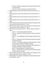 10 o NS-G-2.8: "Recruitment, Q ualification and Training of Personnel for Nu - clear Power Plants", o NS-G-2.14: "Conduct of Operations at Nuclear Power Plants". • DS499 “Application of the Concept of Exemption (revision parts of RS -G-1.7)” – Step 7 • DS499 “Application of the Concept of Exempt ion (revision parts of RS -G-1.7)” – Step 11 • DS500 “Application of the Concept of Clearance (revision parts of RS -G-1.7)” – Step 7 • DS500 “Application of the Concept of Clearance (revision parts of RS -G-1.7)” – Step 11 • DS503 “Protection against Internal and External Hazards in the Operation of Nu - clear Power Plants (revision of NS -G-2.1)” – Step 7 • DS503 “Protection against Internal and External Hazards in the Operation of Nu - clear Power Plants (revision of NS -G-2.1)” – Step 11 • DS509 “Revision by amendment NS -G-4.1 – NS-G-4.6, SSG -10 and SSG -37” – Step 11: o NS-G-4.1: " Commissioning of Research Reactors", o NS-G-4.2: " Maintenance, Periodic Testing and Inspection of Research Reactors", o NS-G-4.3: " Core Management and Fuel Handling for Research Reac - tors", o NS-G-4.4: " Operational Limits and Conditions and Operating Procedures for Research Reactors", o NS-G-4.5: " The Operating Organization and the Recruitment, Training and Qualification of Personnel for Research Reactors", o NS-G-4.6: " Radiation Protection an d Radioactive Waste Management in the Design and Operation of Research Reactors", o SSG -10: " Ageing Management for Research Reactors", o SSG -37: " Instrumentation and Control Systems and Software Important to Safety for Research Reactors". • DS510A “ Safety As sessment for Research Reactors and Preparation of the Safety Analysis Report (Revision of SSG -20)” – Step 11 • DS510B “ Safety in the Utilization and Modification of Research Reactors (Revi - sion of SSG -24)” – Step 11
