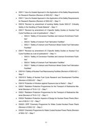 11 • DS511 “Use of a Graded Approach in the Application of the Safety Requirements for Research Reactors (Revision of SSG -22)” – Step 7 • DS511 “Use of a Graded Approach in the Application of the Safety Requirements for Research Reactors (Revision of SSG -22)” – Step 11 • DS516 “Revision by amendment of existing Safety Guide SSG -27: Criticality Safety in the Handling of Fissile Material” – Step 11 • DS517 “Revision by amendment of 3 Specific Safety Guides on Nuclear Fuel Cycle Facilities as a set of publications” – Step 7: o SSG -5: “Safety of Conversion Facilities and Uranium Enrichment Facili - ties” o SSG -6: “Safety of Uranium Fuel Fabrication Facilities” o SSG -7: “Safety of Uranium and Plutonium Mixed Oxide Fuel Fabrication Facilities” • DS517 “Revision by amendment of 3 Specific Safety Guides on Nuclear Fuel Cycle Facilities as a set of publications” – Step 11: o SSG -5: “Safety of Conversion Facilities and Uranium Enrichment Facili - ties” o SSG -6: “Safety of Uranium Fuel Fabrication Facilities” o SSG -7: “Safety of Uranium and Plutonium Mixed Oxide Fuel Fabrication Facilities” • DS518 A “Safety of Nuclear Fuel Reprocessing Facilities (Revision of SSG -42)” – Step 7 • DS518 B “Safety of Nuclear Fuel Cycle Research and Development Facilities (Revision of SSG -43)” – Step 7 • DS519 “ Protec tion of Workers against Exposure due to Radon ” – Step 7 • DS521 “ Radiation Protection Programmes for the Transport of Radioactive Ma - terial (Revision of TS -G-1.3)” – Step 7 • DS521 “ Radiation Protection Programmes for the Transport of Radioactive Ma- terial (Revision of TS -G-1.3)” – Step 11 • DS524 “ Radiation Protection Aspects of Design for Nuclear Power Plants (Revi - sion of NS -G-1.13) ” – Step 7 • DS525 / DPP “ Chemistry Programme for Water Cooled Nuclear Power Plants (Revision of SSG -13)” – Step 3 • DS525 “Chemistry Programme for Water Cooled Nuclear Power Plants (Revision of SSG -13)” – Step 7
