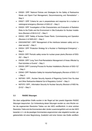 12 • DS52 6 / DPP “ National Policies and Strategies for the Safety of Radioactive Waste and Spent Fuel Management, Decommissioning and Remediation ” – Step 3 • DS52 7 / DPP “ Criteria for use in preparedness and response for a nuclear or radiological emergency (Revision of GSG -2)” – Step 3 • DS52 9 / DPP “ Investigation of Site Characteristics and Evaluation of Radiation Risks to the Public and the Environment in Site Evalu ation for Nuclear Installa - tions (Revision of NS-G-3.2)” – Step 3 • DS532 / DPP “ Safety of Nuclear Power Plants: Commissioning and Operation (Revision 2 of SSR-2/2)” – Step 3 • DS533/NST067 / DPP “ Management of the interfaces between safety and nu - clear securit y” – Step 3 • DS534 / DPP “ Protection Strategy for a Nuclear or Radiological Emergency ” – Step 3 • DS535 / DPP “ Periodic safety review for nuclear power plants (Revision of SSG - 25)” – Step 3 • DS538 / DPP “ Long Term Post -Remediation Management of Areas Affected by Past Activities or Events ” – Step 3 • DS539 / DPP “ Licensing Process for Nuclear Installations (Revision of SSG -12)” – Step 3 • DS540 / DPP “ Radiation Safety for Industrial Radiography (Revision of SSG -11)” – Step 3 • NST005 / DPP „ Nuclear Security Aspects of Regaining Control Over Nu -clear and Other Radioactive Material Out of Regulatory Control“ – Step 3 • NST070 / DPP „ Information Security for Nuclear Security (Revision of NSS No. 23-G)“ – Step 3 3.3 RASSC Sitzungen Die oben aufgezählten Drafts wurden in der Regel auf den jeweils folgenden RASSC Sitzungen besprochen. Zur Vorbereitung dieser Sitzungen wurden ca. eine Woche vor - her die sogenannten Resolution Tables von der IAEO veröffentlicht. In einer solchen Resolution Table sind die Kommentare aller Länder zusammengeführt und von der IAEO bewertet, d. h. ob die jeweiligen Kommentare angenommen oder abgelehnt wurden, ge - gebenenfalls mit einer Begründung. Zusätzlich wird eine Version des Drafts veröffent -