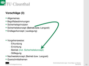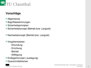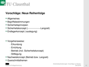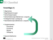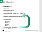 Institut für Endlagerforschung 4Sicherheitsanforderungen: Vorschläge zur Struktur 28.9.2018 Vorschläge Allgemeines Begriffsbestimmungen Sicherheitsprinzipien Sicherheitskonzept (Betrieb bzw. Langzeit ) Nachweiskonzept (Betrieb bzw. Langzeit ) Vorgehensweise: -Erkundung -Errichtung -Betrieb -Stilllegung Endlagerkonzept ( - auslegung) Querschnittsthemen