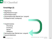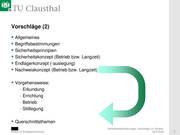 Institut für Endlagerforschung 5Sicherheitsanforderungen: Vorschläge zur Struktur 28.9.2018 Vorschläge (1) Allgemeines Begriffsbestimmungen Sicherheitsprinzipien Sicherheitskonzept (Betrieb bzw. Langzeit ) Nachweiskonzept (Betrieb bzw. Langzeit ) Vorgehensweise: -Erkundung -Errichtung -Betrieb -Stilllegung Endlagerkonzept ( - auslegung) Querschnittsthemen