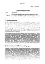 Seite 1 von 6 Datum: 02.03.2021 Leistungsbeschreibung FKZ: 3621S62280 Thema: Fachliche Unterstützung bei der Erarbeitung des Besonderen Notfallplans für kontaminierte Gebiete 1. Aufgabenstellung Gemäß § 99 Absatz 1 StrlSchG sind besondere Notfallpläne als Ergänzung und Konkretisierung des Allgemeinen Notfallplans des Bundes (ANoPl) zu erstellen. Einer dieser Pläne ist nach § 99 Absatz 2 Nummer 8 StrlSchG der Besondere Notfallplan für kontaminierte Gebiete (BNoPlkG). Die Erarbeitung des BNoPlkG umfasst grundsätzliche, organisatorische, juristische und technische Fragestellungen in Bezug auf den Umgang mit bzw. die Beseitigung von kontaminierten Objekten um ein sicheres Alltagsleben bei minimierten Einschränkungen für die verbleibende Bevölkerung zu ermöglichen oder eine rasche Rückkehr von Bewohnern in kontaminierte Gebiete zu realisieren. Die Auftragnehmerin hat zunächst den aktuellen Stand von Wissenschaft und Technik zu ermitteln und insbesondere fachliche Unterstützung zu den organisatorischen und technischen Fragestellungen bei der Erarbeitung des BNoPlkG zu leisten. Neben der Unterstützung bei der inhaltlichen Ausgestaltung des BNoPlkG müssen auch Schnittstellen und Stakeholder auf Bundes- und Landesebene identifiziert und in die Koordinierungsprozesse für die Erstellung des BNoPlkG mit einbezogen werden. Die Koordinierungsprozesse sind fachlich und organisatorisch zu begleiten. Während der Erarbeitung des BNoPlkG und der Koordinierungsprozesse aufgetretene Herausforderungen, die nicht ohne größeren Aufwand behoben werden können, sollen als Teil eines geplanten Evaluierungsprozesses gesammelt und dokumentiert werden. 2. Kenntnisstand und Rahmenbedingungen Das BMU ist für den Schutz der Bevölkerung in bestehenden Expositionssituationen infolge eines Notfalls durch kontaminierte Gebiete das zuständige Bundesministerium. Damit ist es für die Erarbeitung des besonderen Notfallplans für kontaminierte Gebiete nach § 99 Absatz 2 Nummer 8 StrlSchG zuständig. Die Erstellung des BNoPlkG bzw. die hierbei erforderliche Unterstützungsleistung der Auftragnehmerin soll unter Berücksichtigung der geltenden rechtlichen Regelungen erfolgen. Insbesondere ergeben sich Anforderungen aus dem Strahlenschutzrecht (z. B. Anlage 6 StrlSchG) sowie aus dem ANoPl aber ggf. auch aus anderen Rechtsbereichen. Außerdem sollen bei der Erstellung des Plans internationale Erfahrungen aus anderen Ländern (z. B. aus Weißrussland, Japan) sowie Expertengremien bzw. –organisationen (z. B. IAEA) einfließen. Bei der Erstellung des BNoPlkG soll eine angemessene