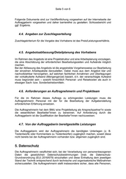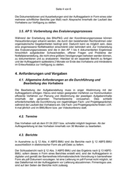 Seite 4 von 6 Die Dokumentationen und Ausarbeitungen sind der Auftraggeberin in Form eines oder mehrerer schriftlicher Berichte (per Mail) nach Absprache innerhalb der Laufzeit des Vorhabens zur Verfügung zu stellen. 3.5. AP 5: Vorbereitung des Evaluierungsprozesses Während der Erarbeitung des BNoPlkG und der Koordinierungsprozesse können Herausforderungen erkannt werden, die durch den bestehenden Rechtsrahmen oder organisatorische Gegebenheiten bedingt sind. Dadurch kann es möglich sein, dass eine angemessene Notfallreaktion einschränkt oder behindert wird. Zur Vorbereitung des Evaluierungsprozesses sind die in den AP 1 bis 4 dokumentierten Ergebnisse hinsichtlich aufgedeckter Schwachstellen, offener Fragen und Probleme der Notfallplanerstellung, die nicht ohne größere Verzögerungen behoben werden können, zu dokumentieren und zu analysieren. Hierüber ist ein separater Bericht zu fertigen und der Auftraggeberin spätestens 2 Monate vor Ende des Vorhabens und mindestens im Entwurfsstatus zur Verfügung zu stellen. 4. Anforderungen und Vorgaben 4.1. Allgemeine Anforderungen an die Durchführung und Bearbeitung des Vorhabens Die Bearbeitung der Aufgabenstellung muss in enger Abstimmung mit der Auftraggeberin erfolgen. Hierzu sind neben geeigneten Verfahren zur Kommunikation effiziente Verfahren zur Planung und Abstimmung der jeweiligen Aufgabeninhalte innerhalb der genannten Themenbereiche vorzusehen. Dies schließt erforderlichenfalls die Durchführung von regelmäßigen Fach- und Projektgesprächen während der Laufzeit des Vorhabens ein. Die Fach- und Projektgespräche finden i.d.R. 4-mal jährlich und im BMU/Bonn bzw. per Videokonferenz statt. 4.2. Termine Das Vorhaben soll ab dem 01.04.2021 bzw. schnellst möglich beginnen. Ab der Auftragserteilung ist das Vorhaben innerhalb von 36 Monaten zu bearbeiten. 4.3. Berichte In Ausnahme zu § 12 Abs. 4 ABFE-BMU sind die Berichte nach § 12 ABFE-BMU ausschließlich in elektronischer Form als pdf-Datei zu liefern. Der Schlussbericht nach § 12 Abs. 3 ABFE-BMU und das Ergebnis nach § 13 ABFE- BMU, sofern dieses in Form eines Berichtes erstellt wird, sind der Auftraggeberin in digitaler und gemäß der Barrierefreie-Informationstechnik-Verordnung in barrierefreier Form als pdf-Dokument vorzulegen. Ist eine Lieferung im pdf-Format nicht möglich, ist das Dateiformat mit der Auftraggeberin vor Lieferung abzustimmen. Firmenlogos usw. sind auf den Seiten der Berichte nicht zulässig.