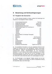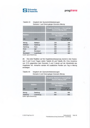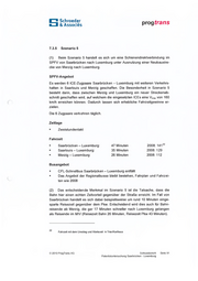 Schroeder & Associes prog trans Tabelle 48: Relevante Kennzahlen nach Szenarien 2020 Relevante Kennzahlen nach Szenarien (Neuverkehr) 2020 Szenarien Nr. 3 Nr. 4 Nr. 5 Pkm insg. / Tag Pkm / Zug-km / Tag33'020 38'100 38'100 64'960 32720 25 31 26 26 34 Zug-km insg. / Tag Bahn-Reisende pro Tag / Richtung Quelle: eigene Berechnung.1'060 1'480 1'480 2'620 970 200 580 250 230 200 (4) Der Neuverkehr liegt bei allen fünf Szenarien zwischen 25 und 34 Pkm/Zug-km, also recht dicht beieinander. Die Szenarien 1 und 5 weisen eine etwas höhere Auslastung auf, was ein Indiz für eine etwas bessere nach fragegerechte Angebotsgestaltung ist. Die Auslastungen in den Szenarien 2, 3 und 4 sind sehr ähnlich. Die hohe Verkehrsleistung im Szenario 4 ist im Zu sammenhang mit den 14 Zugpaaren zu sehen; in den anderen Szenarien werden zusätzlich 4 bzw. 6 Zugpaare unterstel It. Tabelle 49: Vergleich der Reisezeiten 2008 und Szenarien 1-5 mReisezeit in Minuten nach Luxemburg 2008 / 2020 . . .von Szenario 2 Szenario 3 Szenario 4 Szenario 5 Szenario 1 2008 90 75 47 Saarbrücken Saarlouis Dillingen Merzig Saarburg141 109 90 59 35 129 92 75 75 56 126 87 64 26 112 78 64 47 94 45 55 45 Vorsprung Reisezeit mit Bus CFL-Bus Saar-LUX Bus 155* Merzig- LUX * Von Merzig Hbf bis Lux Royal 2 Quelle: eigene Berechnung-28 Min +34 Min +15 Min +15 Min OMin 75 -26 Min -43Min -64Min 90 -12 Min -26 Min (5) Die Angebotsveränderungen in allen Szenarien bewirken Reisezeitein sparungen gegenüber der aktuellen Situation. Streckenbezogen wird die Rei sezeiteinsparung besonders deutlich im grenznahen Gebiet. Szenarienbezo gen bewirken die Annahmen der Szenarien 4 und 5 einen spürbaren Quali- Schlussbericht Seite 100 Potentialuntersuchung Saarbrücken - Luxemburg© 2010 ProgTrans AG