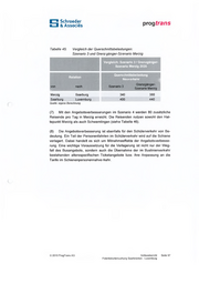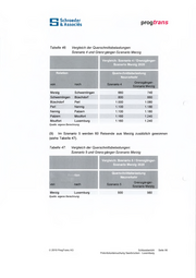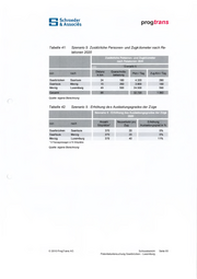 Schroeder & Associes prog trans Tabelle 41: Szenario 5: Zusätzliche Personen- und Zugkilometer nach Re lationen 2020 Zusätzliche Personen- und Zugkilometer nach Relationen 2020 ___Szenario 5mm Distanz Querschnitts in km belastungPkm / Tag Zug-Km/Tag Saarbrücken Saarlouis Merzig GesamtSaarlouis Merzig Luxemburg290 24 180 4.320 3.900 24.500 32.72015 260 180 49 500 590 1.060 88 Quelle: eigene Berechnung Szenario 5 : Erhöhung des Auslastungsgrades der Züge Tabelle 42: Szenario 5 - Erhöhung des Auslastungsgrades der Züge j 2020 __ Anzahl Neuverkehr pro Sitzplätze*Erhöhung Auslastungsgrad in % Zug Saarlouis Merzig Luxemburg * 5 Passagierwagen ä 74 SitzplätzeSaarbrücken Saarlouis Merzig5% 370 20 5% 370 20 11% 370 40 Quelle: eigene Berechnung © 2010 ProgTrans AG Schlussbericht Seite 93 Potentialuntersuchung Saarbrücken - Luxemburg