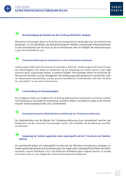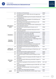 STADT ESSEN KATASTROPHENSCHUTZBEDARFSPLAN Stand: 19.04.2022 165 8 MAßNAHMENKATALOG Sowohl die Gesamtmenge als auch der qualitative Umfang der Anpassungsbedarfe innerhalb der ein- zelnen Maßnahmen übersteigt die derzeitige Leistungsfähigkeit der hiermit betrauten Organi sations- einheit(en) bei Weitem. Die Priorisierung berücksichtigt diesen Umstand, in dem auch eigentlich sehr hohe Prioritäten teilweise abgestuft als hohe oder mittlere Prioritäten abgeleitet wurden. Die Priorisie- rung berücksichtigt grundsätzlich: ○ die szenarienübergreifende Bedarfsableitung (Querschnittsfähigkeiten haben Vorrang), ○ wechselseitige Abhängigkeiten zwischen einzelnen Handlungsmaßnahmen sowie ○ die Leistungsfähigkeit der Unteren Katastrophenschutzbehörde inkl. des notwendigen Vorlaufs zur einsatz - und handlungsfähige n Nachsteuerung von Personalressourcen. Vor allem die Behebung des letztgenannten Punktes ist immanente Voraussetzung für die zeitnahe Be- arbeitung der weiteren Handlungsfelder. Aus diesem Grund ist die Maßnahme 52 zur organisatorischen und personalwirtschaftlichen Optimierung singulär mit der „h öchsten Priorisierung“ belegt. Tabelle 15: Maßnahmenkatalog Fachdienst Nr. Maßnahmen Priorität Führung und Kommunikation 1 Sicherstellung der Einsatzfähigkeit des Krisenstabes Sehr h och 2 Alarmierung von Stabsmitgliedern sowohl für den Füh- rungs - als auch für den Krisenstab Sehr h och 3 Neuorganisation der KGS Sehr h och 4 Bereitstellen redundanter geeigneter Räumlichkeiten für den Krisen - und Führungsstab Hoch 5 Neubeschaffung der Stabssoftware inklusive Hardware Sehr h och 6 Konzeptionierung der durchgängigen Stromversorgung von Stabsbereichen Sehr h och 7 Einbindung von Spontanhelfenden und Privatwirtschaft Hoch 8 Beschaffung eines ELW 3 Mittel 9 Vorbereitung von Abschnittsführungsstellen Mittel 10 Sicherung der Sonderlagefähigkeit der Leitstelle Sehr h och 11 Technische Härtung der digitalen Alarmierung Hoch 12 Organisatorische Sicherstellung der Personalverfügbarkeit Sehr h och 13 Konzeptionierung der Notstromversorgung von Kommuni- kationssystemen Hoch 14 Beschaffung von Satellitentelefonen Hoch 15 Beschaffung von geländegängigen Kleinfahrzeugen sowie ATV Mittel 16 Definition von 5 geeigneten und ausreichend dimensionier- ten Bereitstellungsräumen Sehr h och 17 Führungsressourcen zur Führung von Bereitstellungsräu- men Hoch 18 Einrichtung eines organisationsübergreifenden Führungs- kräftepools Mittel 19 Entwicklung eines Warnkonzeptes Sehr h och