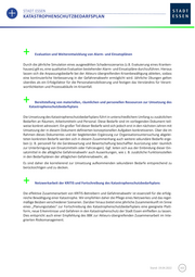 STADT ESSEN KATASTROPHENSCHUTZBEDARFSPLAN Stand: 19.04.2022 163 + Evaluation und Weiterentwicklung von Alarm - und Einsatzpl änen Durch die jährliche Simulation eines ausgewählten Schadensszenarios (z.B. Evakuierung eines Kranken- hauses ) gilt es , eine qualitative Evaluation bestehender Alarm - und Einsatzpläne durchzuführen. Hieraus lassen sich die Anpassungsbedarfe bei der Akteurs -übergreifenden Krisenbewältigung ableiten, sodass eine kontinuierliche Verbesserung in der Gefahrenabwehr ermöglicht wird. Jährliche Übungen gelten überdies als ein Erfolgsfaktor für die Personalsensibilisierung und festigen das Verständnis für Verant- wortlich keiten und Prozessabläufe im Krisenfall. + Bereitstellung von materiellen, räumlichen und personellen Ressourcen zur Umsetzung des Katastrophenschutzbedarfsplans Die Umsetzung des Katastrophenschutzbedarfsplans führt in unterschiedliche m Umfang zu zusätzlich en Bedarfe n an Räumen, Arbeitsmitteln und Personal. Diese Bedarfe sind im vorliegenden Dokument teil- weise konkret adressiert. Ein großer Teil dieser Bedarfe wird sich jedoch erst in den nächsten Jahren mit Umsetzung der in diesem Dokument definierten konze ptionellen Aufgaben konkretisieren. Über die im Rahmen dieses Dokumentes und der begleitenden Ergänzung zur Organisationsuntersuchung abgelei- teten konkreten Bedarfe werden sich in diesem Zusammenhang auch weitere sekundäre Bedarfe erge- ben (z. B. personell für die Gerätewartung und Bewirtschaftung beschaffter Ausrüstung oder räumlich zur Unterbringung von Einsatzmitteln oder Fahrzeugen). Ggf. leiten sich aus der Einbindung dieser Ein- satzmittel in die alltägliche Gefahrenabwehr auch Auswirkungen , wie z. B. zu sätzliche Funktionsstellen in den Bedarfsplänen der alltäglichen Gefahrenabwehr , ab. Es sind daher die korrelierend zu r Umsetzung auf kommenden sekundären Bedarfe entsprechend zu berücksichtigen und zu decken . + Netzwerkarbeit der KRITIS und Fortschreibung des Katastrophenschutzbedarfsplan s Die effektive Zusammenarbeit von KRITIS -Betreibern und Gefahrenabwehr ist essenziell für die erfolg- reiche Bewältigung einer Katastrophe. Wir empfehlen daher die Pflege eines Netzwerkes und das regel- mäßige Beüben verschiedener Szenarien. Darüber hinaus bietet eine jährliche Zusammenkunft im Sinne eines „Planungsstabes“ zur Fortschreibung des Katastrophenschutzbedarfsplans eine geeignete Platt- form, neue Erkenntnisse und Gefahren in den Ka tastrophenschutz der Stadt Essen einfließen zu lassen. Dies entspricht auch einer Empfehlung des BBK zur Akteurs -übergreifenden Zusammenarbeit im Inte- grierten Risikomanagement .