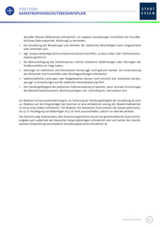 STADT ESSEN KATASTROPHENSCHUTZBEDARFSPLAN Stand: 19.04.2022 65 aktuellen Monat) Maßnahmen erforderlich, um negative Auswirkungen hinsichtlich der Grundbe- dürfnisse (Nahrungsmittel, Wohnung) zu vermeiden. ○ Die Auszahlung der Besoldungen und Gehälter der städtischen Beschäftigten kann eingeschränkt oder verhindert sein. ○ Ggf. sind grundständige Kommunikationsstrukturen betroffen, so dass E -Mail - oder Telefonkommu- nikation gestört ist. ○ Die Beeinträchtigung des Verkehrsservers könnte erhebliche Gefährdungen oder Störungen des Straßenverkehrs zur Folge haben. ○ Zahlungen an Lieferanten und Dienstleister können ggf. nicht gebucht werden . Zur Unterstützung der Wirtschaft sind Finanzh ilfen oder Abschlagszahlungen erforderlich . ○ Gebührenpflichte Leistungen oder Bußgeldsachen können nic ht erbracht bzw. bearbeitet werden, was ggf. zu Auswirkungen auf die städtische Haushaltsplanung führt . ○ Die Handlungsfähigkeit der politischen Selbstverwa ltung ist bedroht, wenn zentrale Einrichtungen des Ratsinformationssystems, Beschlussvorlagen und -controlling etc. korrumpiert sind . Zur Reaktion auf das auslösende Ereignis, zur Sicherung der Handlungsfähigkeit der Verwaltung als auch zur Reaktion auf die Ereignisfolgen bei Externen ist eine einheitliche Leitung der Abwehrmaßnahmen im Sinne eines Stabes erforderlich . Die Reaktion mit klassischen Instrumenten des Katastrophenschut- zes (z. B. Verpflegung von Bedürftigen etc.) ist nicht auszuschließen, jedoch nur abstrakt denkbar. Das Szenario zeigt insbesondere, dass Krisenmanagementstrukturen als gesamtstä dtische Querschnitts- aufgabe auch außerhalb der klassischen Katastrophenlagen erforderlich sind und hierbei die interdis- ziplinäre Einbeziehung verschiedener Verwaltungsbereiche erforderlich ist.