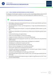 STADT ESSEN KATASTROPHENSCHUTZBEDARFSPLAN Stand: 19.04.2022 66 4.2.7 RESULTIERENDE ANFORDERUNGEN AUS DEM SZENARIO Die folg enden Anforderungen resultieren zum einen aus dem vorstehend geschilderten Szenarioverlauf und schließen zum anderen unmittelbar aus den Expertengesprächen abgeleitete Bedarfe ein. + Anforderungen und planerisches Versorgungsniveau ○ Rechtzeitige, umfassende und fortlaufende Information und Warnung der Bevölkerung inklusive einer aufsuchenden Kommunikation ○ Zentrale Koordination in Krisen - und Führungsstab bis zu 7 Tage sowie die flächend eckende La- geerkundung ○ Aufrechterhaltung der Kommunikations - und Alarmierungsfähigkeit (Gefahrenabwehr und KRI- TIS) ○ Schaffung von Anlaufstellen für die Aufnahme von Hilfeersuchen der Bevölkerung (KatS -Leucht- türme) ○ Umfassende Erkundung und Lagedarstellung ○ Aufbau einer Kraftstofflogistik zur Notstromversorgung ○ Umgang mit erhöhtem Aufkommen an Technischen Hilfeleistungen ○ Fähigkeit der Notstromversorgung der Feuerwehr bzw. andere r Akteure der nicht -polizeilichen Gefahrenabwehr ○ Versorgung der Bevölkerung mit Lebensmitteln und alltäglichem Grundbedarf ○ Bewältigung von Ausfällen der Pumpwerke des EGLV ○ Aufrechterhalten der öffentlichen Sicherheit und Ordnung ○ Business Continuity Manageme nt der Verwaltung sicherstellen ○ Sicherung der medizinischen Versorgung über alle Sektoren ○ Einrichtung und Betrieb von Betreuungsstellen für vulnerable Gruppen (Dialysen, Heimbeat- mung etc.) sowie Transport mit RTW/KTW ○ Stärkung der Selbsthilfefähigkeit der B evölkerung und Wirtschaft ○ Sicherstellung der Betreuung der Kinder von KRITIS -, BOS - und Verwaltungsmitarbeitenden (Not- betreuung) ○ Ganzheitliche vorbereitende Konzeptionierung von möglichen Angriffsszenarien auf die IT -Struk- turen der Stadtverwaltung