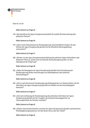 Seite 69 von 83 441. „War der BUND e.V. nach Erkenntnissen der Bundesregierung in der Vergangenheit an politischen Kampagnen beteiligt und wenn ja, welche?“ Siehe Antwort zu Frage 33. 442. „Wie wird sichergeste llt, dass die Aktivitäten von dem BUND e.V. nicht gegen das parteipolitische Neutralit ätsgebot verstoßen?“ Siehe Antwort zu Frage 34. 443. „Gibt es Belege dafür, dass der BUND e.V. einseitige Narrative in politischen Debatten fördert und wenn ja, welche?“ Siehe Antwort zu Frage 35. 444. „Wie beeinflusst der BUND e.V. die mediale Berichterstattung über politische Themen?“ Siehe Antwort zu Frage 36. 445. „Gibt es nach Erkenntnissen der Bundesre gierung wissenschaftliche Studien, die den Einfluss von dem BUND e.V. auf die öffe ntliche Meinungsbildung untersuchen?“ Siehe Antwort zu Frage 37. 446. „Werden von dem BUND e.V. gezielt politische Gegner diskreditiert oder diffamiert? Wenn ja, welche und wie beurteilt die Bundesregierung dies vor dem Hintergrund der Förderung?“ Siehe Antwort zu Frage 38. 447. „Haben die Kampagnen von dem BUND e. V. nach Einschätzung der Bundesregierung direkte Auswirkungen auf Wahlergebnisse oder politische Entscheidungen?“ Siehe Antwort zu Frage 40. 448. „Gibt es nach Kenntnis der Bundesregierun g Stellungnahmen von Staatsrechtlern, die die Aktivitäten von dem BUND e.V. im Hinblic k auf das Neutralitätsgebot bewerten?“ Siehe Antwort zu Frage 41.