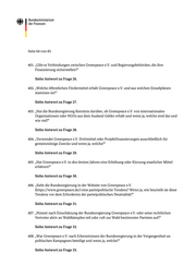 Seite 64 von 83 401. „Gibt es Verbindungen zwischen Greenpe ace e.V. und Regierungsbehörden, die ihre Finanzierung sicherstellen?“ Siehe Antwort zu Frage 26. 402. „Welche öffentlichen Fördermittel erhält Greenpeace e.V. und aus welchen Einzelplänen stammen sie?“ Siehe Antwort zu Frage 27. 403. „Hat die Bundesregierung Kenntnis darübe r, ob Greenpeace e.V. von internationalen Organisationen oder NGOs aus dem Ausland Geld er erhält und wenn ja, welche sind das und wie viel?“ Siehe Antwort zu Frage 28. 404. „Verwendet Greenpeace e.V. Drittmittel oder Projektfinanzierungen ausschließlich für gemeinnützige Zwecke und wenn ja, welche?“ Siehe Antwort zu Frage 29. 405. „Hat Greenpeace e.V. in den letzten Jahren eine Erhöhung oder Kürzung staatlicher Mittel erfahren?“ Siehe Antwort zu Frage 30. 406. „Sieht die Bundesregierung in der Website von Greenpeace e.V. (https://www.greenpeace.de/) eine parteipolitische Tendenz? Wenn ja, wie beurteilt sie diese Tendenz vor dem Erfordernis der parteipolitischen Neutralität?“ Siehe Antwort zu Frage 31. 407. „Nimmt nach Einschätzung der Bundesregi erung Greenpeace e.V. oder seine rechtlichen Vertreter aktiv an Wahlkämpfe n teil oder ruft zur Wahl bestimmter Parteien auf?“ Siehe Antwort zu Frage 32. 408. „War Greenpeace e.V. nach Erkenntnissen der Bundesregierung in der Vergangenheit an politischen Kampagnen beteiligt und wenn ja, welche?“ Siehe Antwort zu Frage 33.