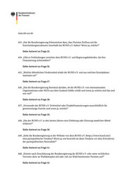 Seite 68 von 83 433. „Hat die Bundesregierung Erkenntni sse dazu, dass Parteien Einfluss auf die Entscheidungsstrukturen innerhalb des BUND e.V. haben? Wenn ja, welche?“ Siehe Antwort zu Frage 25. 434. „Gibt es Verbindungen zwischen dem BU ND e.V. und Regierungsbehörden, die ihre Finanzierung sicherstellen?“ Siehe Antwort zu Frage 26. 435. „Welche öffentlichen Fördermittel erhält der BUND e.V. und aus welchen Einzelplänen stammen sie?“ Siehe Antwort zu Frage 27. 436. „Hat die Bundesregierung Kenntnis darübe r, ob der BUND e.V. von internationalen Organisationen oder NGOs aus dem Ausland Geld er erhält und wenn ja, welche sind das und wie viel?“ Siehe Antwort zu Frage 28. 437. „Verwendet der BUND e.V. Drittmittel od er Projektfinanzierungen ausschließlich für gemeinnützige Zwecke und wenn ja, welche?“ Siehe Antwort zu Frage 29. 438. „Hat der BUND e.V. in den letzten Jahren eine Erhöhung oder Kürzung staatlicher Mittel erfahren?“ Siehe Antwort zu Frage 30. 439. „Sieht die Bundesregierung in der Websit e von dem BUND e.V. (https://www.bund.net/) eine parteipolitische Tendenz? Wenn ja, wie beurteilt sie diese Tendenz vor dem Erfordernis der parteipolitisc hen Neutralität?“ Siehe Antwort zu Frage 31. 440. „Nimmt nach Einschätzung der Bundesregi erung der BUND e.V. oder seine rechtlichen Vertreter aktiv an Wahlkämpfe n teil oder ruft zur Wahl bestimmter Parteien auf?“ Siehe Antwort zu Frage 32.
