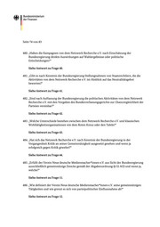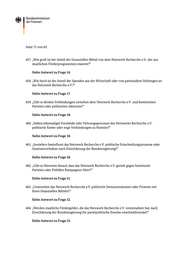 Seite 71 von 83 457. „Wie groß ist der Anteil der finanziellen Mittel von dem Netzwerk Recherche e.V., der aus staatlichen Förderprogrammen stammt?“ Siehe Antwort zu Frage 16. 458. „Wie hoch ist der Anteil der Spenden aus der Wirtschaft oder von parteinahen Stiftungen an das Netzwerk Recherche e.V.?“ Siehe Antwort zu Frage 17. 459. „Gibt es direkte Verbindungen zwischen dem Netzwerk Recherche e.V. und bestimmten Parteien oder politischen Akteuren?“ Siehe Antwort zu Frage 18. 460. „Haben (ehemalige) Vorstände oder Führ ungspersonen des Netzwerks Recherche e.V. politische Ämter oder enge Verbindungen zu Parteien?“ Siehe Antwort zu Frage 18. 461. „Inwiefern beeinflusst das Netzwerk Recher che e.V. politische Entscheidungsprozesse oder Gesetzesvorhaben nach Einschätzung der Bundesregierung?“ Siehe Antwort zu Frage 20. 462. „Gibt es Hinweise darauf, dass das Netz werk Recherche e.V. gezielt gegen bestimmte Parteien oder Politiker Kampagnen führt?“ Siehe Antwort zu Frage 21. 463. „Unterstützt das Netzwerk Recherche e.V. politische Demonstrationen oder Proteste mit ihren finanziellen Mitteln?“ Siehe Antwort zu Frage 22. 464. „Werden staatliche Fördergelder, die das Netzwerk Recherche e.V. vereinnahmt hat, nach Einschätzung der Bundesregierung für pa rteipolitische Zwecke zweckentfremdet?“ Siehe Antwort zu Frage 23.