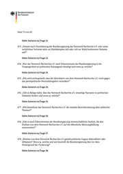 Seite 73 von 83 Siehe Antwort zu Frage 31. 473. „Nimmt nach Einschätzung der Bundesregier ung das Netzwerk Recherche e.V. oder seine rechtlichen Vertreter aktiv an Wahlkämpfen teil oder ruft zur Wahl bestimmter Parteien auf?“ Siehe Antwort zu Frage 32. 474. „War das Netzwerk Recherche e.V. na ch Erkenntnissen der Bu ndesregierung in der Vergangenheit an politischen Kampag nen beteiligt und wenn ja, welche?“ Siehe Antwort zu Frage 33. 475. „Wie wird sichergestellt, dass die Aktivitäten von dem Netzwerk Recherche e.V. nicht gegen das parteipolitische Neut ralitätsgebot verstoßen?“ Siehe Antwort zu Frage 34. 476. „Gibt es Belege dafür, dass das Netzwerk Re cherche e.V. einseitige Narrative in politischen Debatten fördert und wenn ja, welche?“ Siehe Antwort zu Frage 35. 477. „Wie beeinflusst das Netzwerk Recherche e. V. die mediale Berichterstattung über politische Themen?“ Siehe Antwort zu Frage 36. 478. „Gibt es nach Erkenntnissen der Bundesre gierung wissenschaftliche Studien, die den Einfluss von dem Netzwerk Recherche e.V. auf die öffentliche Meinungsbildung untersuchen?“ Siehe Antwort zu Frage 37. 479. „Werden von dem Netzwerk Recherche e.V. gezielt politische Gegner diskreditiert oder diffamiert? Wenn ja, welche und wie beurteilt die Bundesregierung dies vor dem Hintergrund der Förderung?“ Siehe Antwort zu Frage 38.